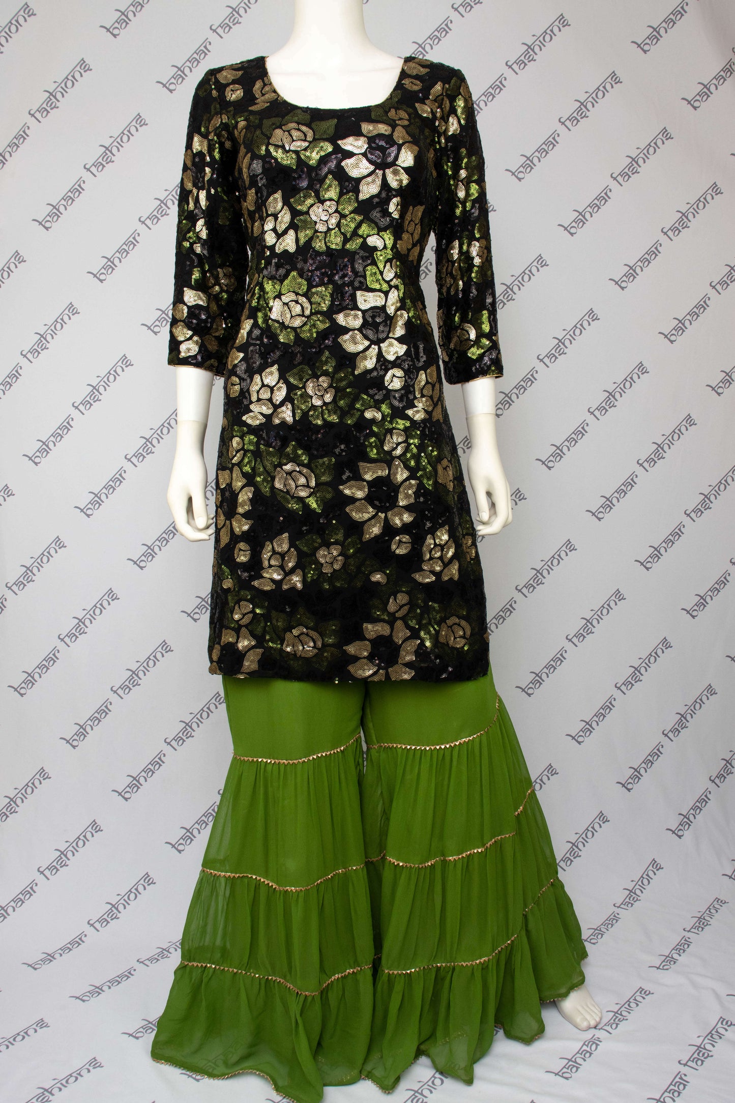 The kameez has beautiful sequins embroidery, latkan, and a zipper on the back. The 3-layer sharara is embellished with gotta lace and elastic at the waist. The mukaish chinnon dhuppata is decorated with lace trim approximately 1.5 inches in width.