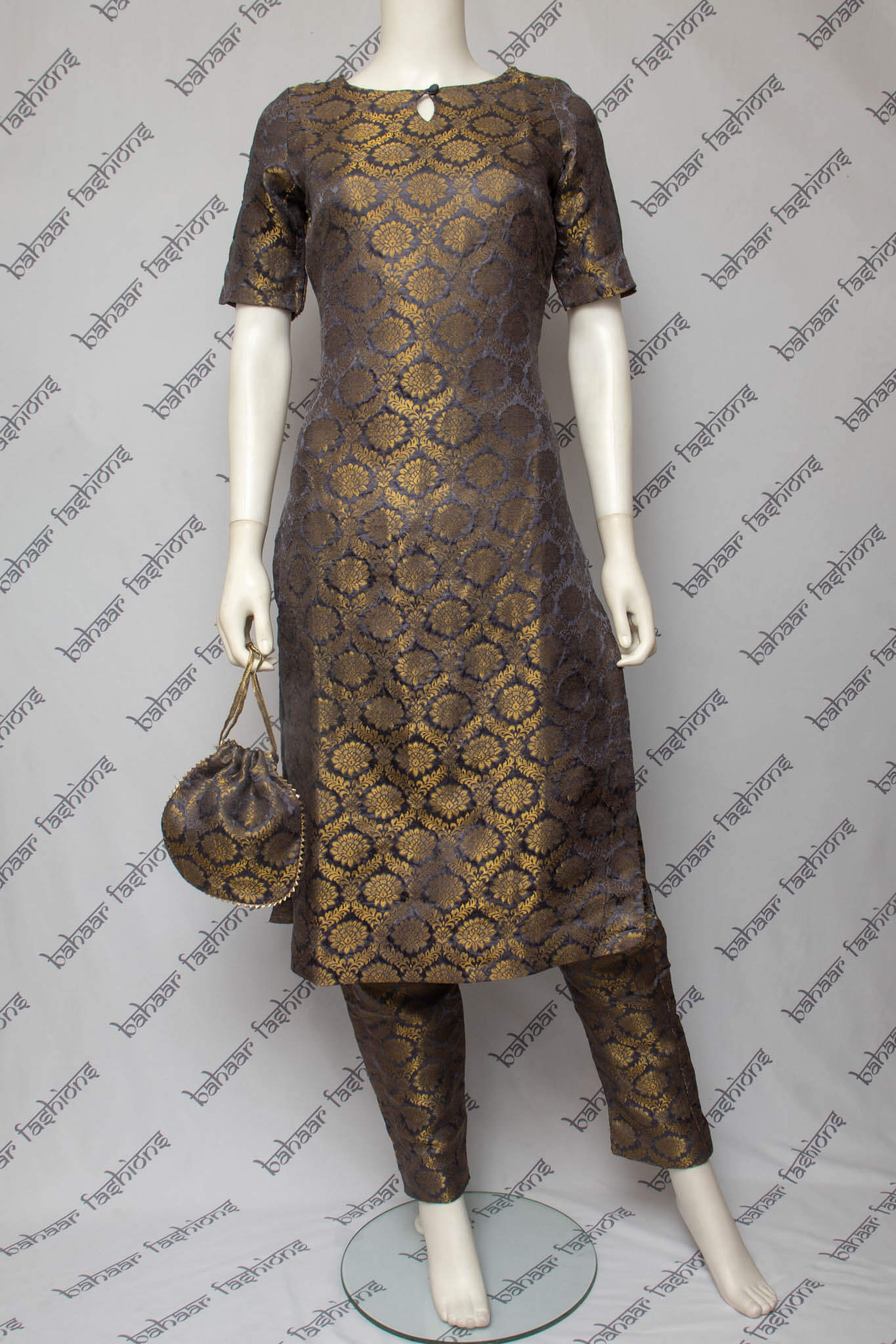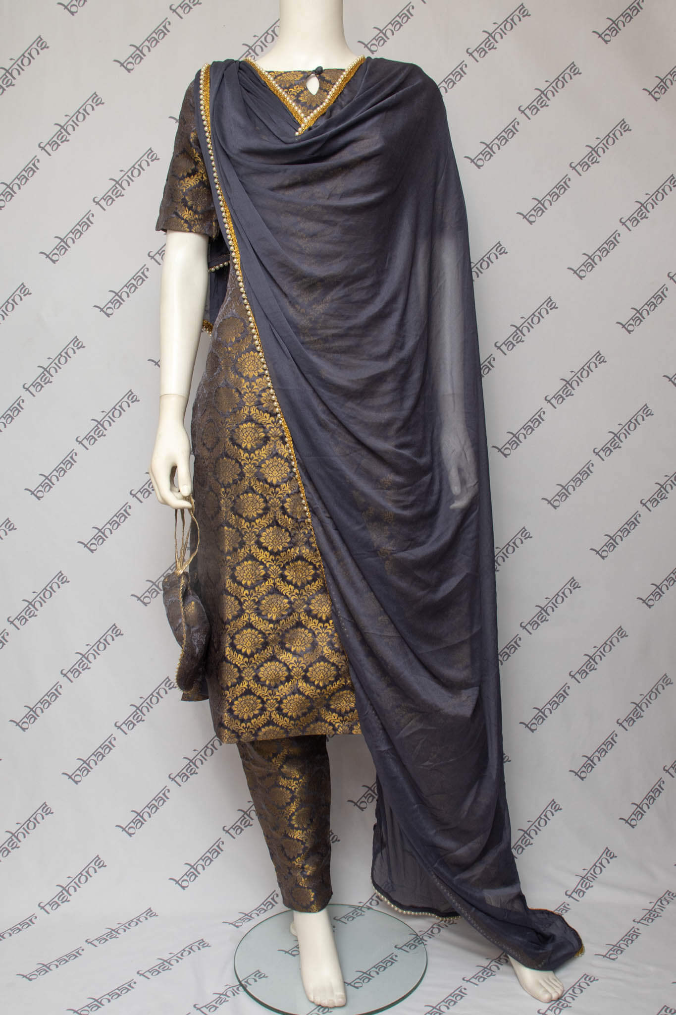 Exquisite banarsi silk trouser pants suit paired with a chinnon dupatta. The pants have pockets and elastic at the waist. The dupatta is decorated with a white pearl lace trim 0.5 inches in width. The polti bag is decorated with gotta trim.