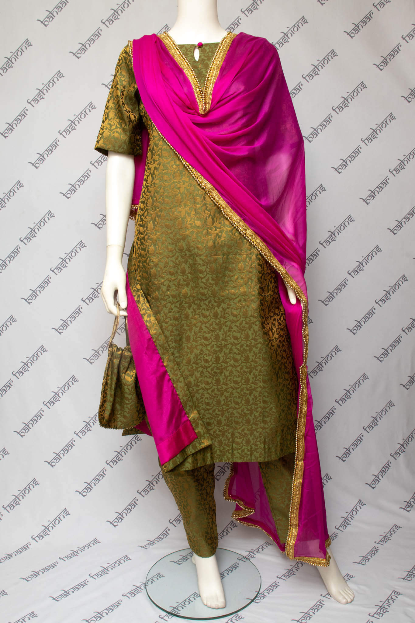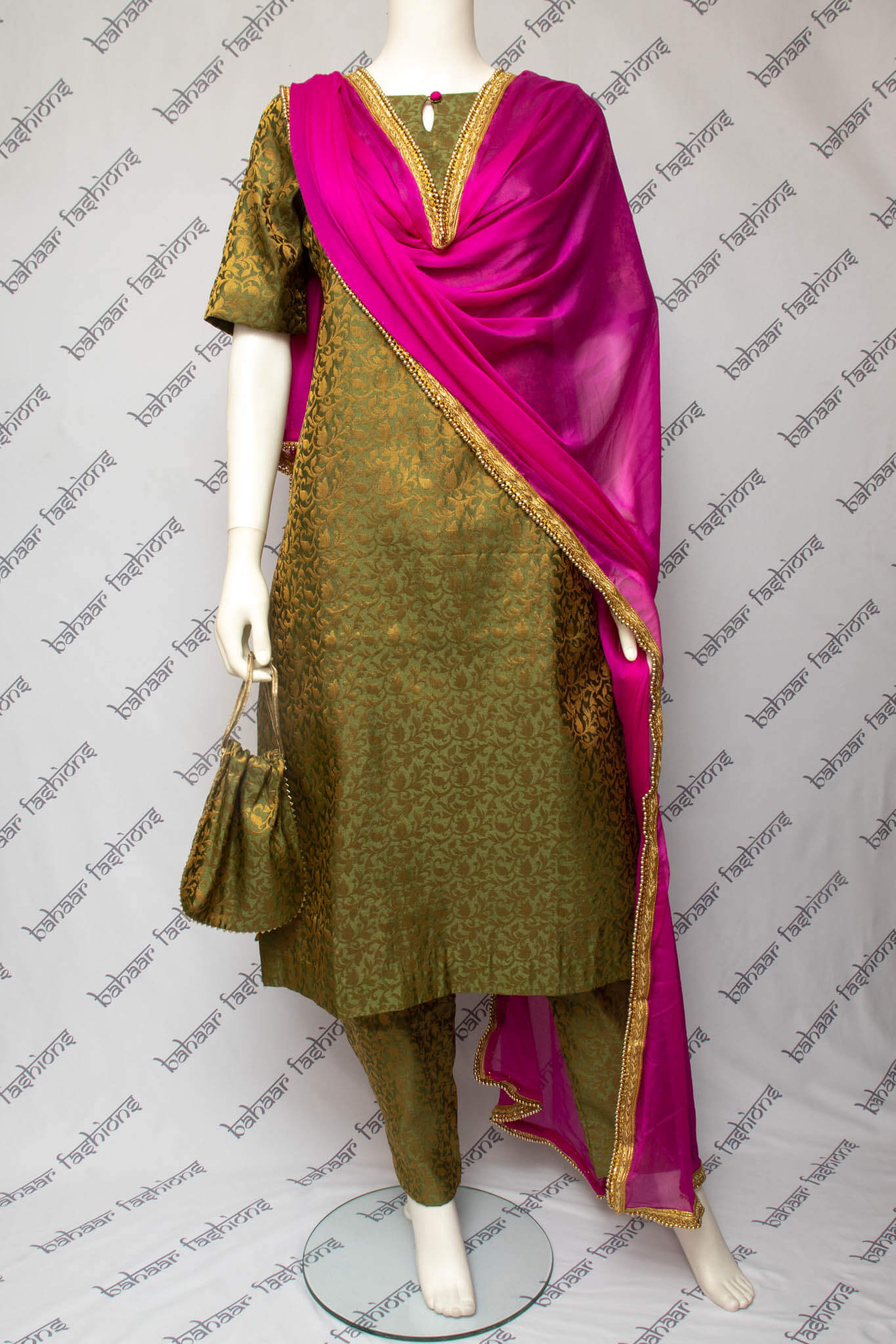 Exquisite banarsi silk trouser pants suit paired with a chinnon dupatta. The lining on the enitre suit is colour hot pink, matching the dhuppata. The pants have pockets and elastic at the waist. The dupatta is decorated with a white pearl lace trim 0.5 inches in width. The polti bag is decorated with gotta trim.