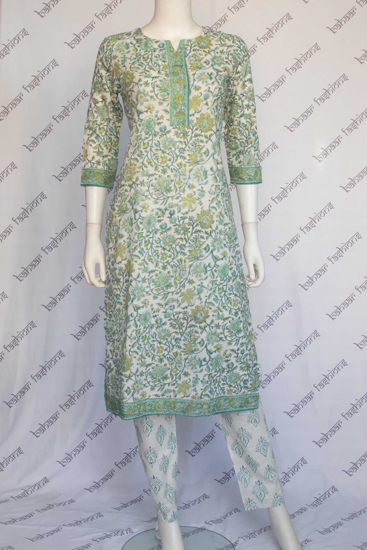 Stay effortlessly stylish in this soft cotton suit featuring a beautiful floral block print, paired with a chiffon dupatta with silver gotta lace. Comfortable fit with pockets in pants, perfect for simple, everyday elegance.