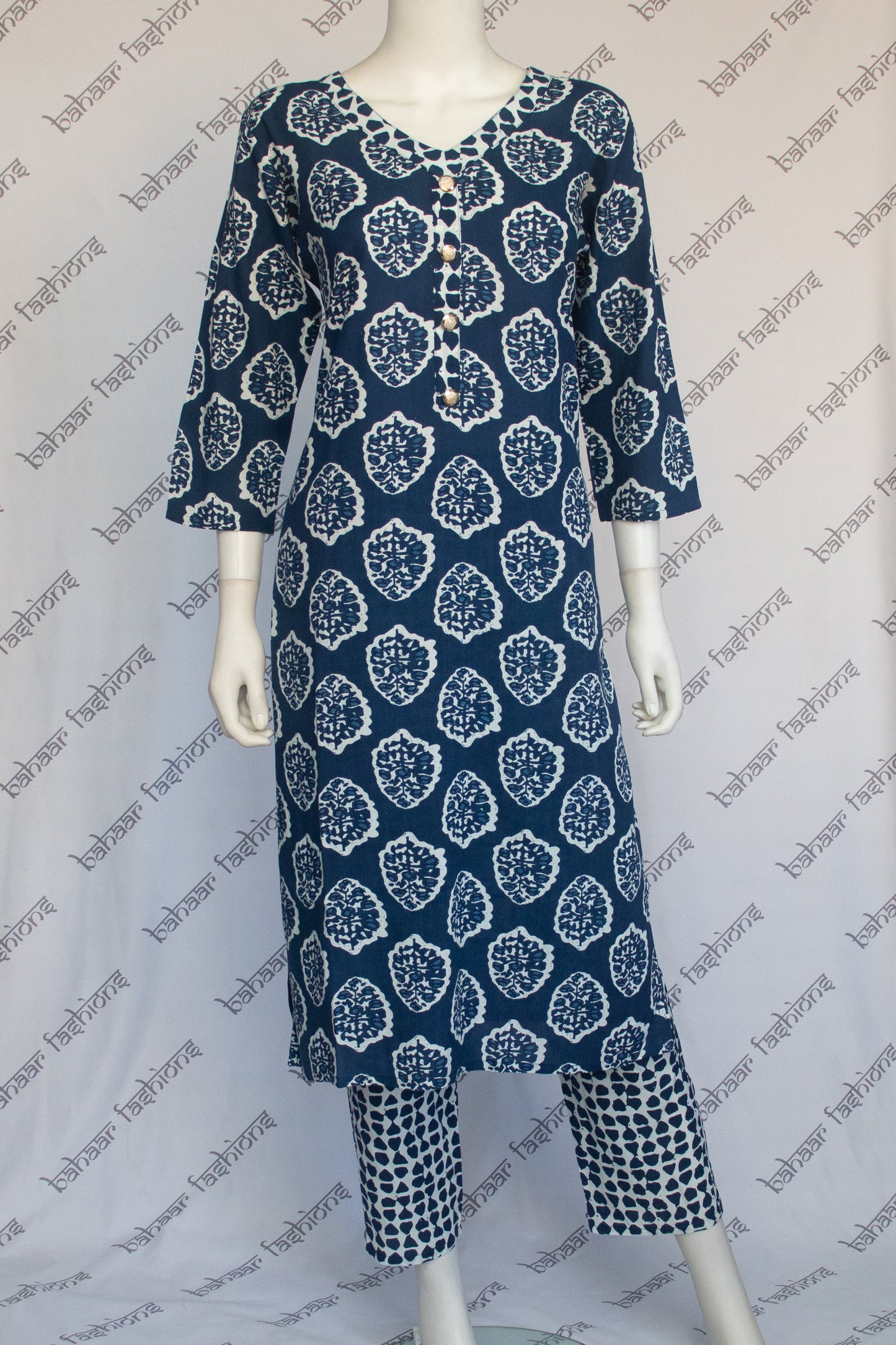 Beautiful blue block print cotton suit paired with a matching cotton dupatta. Comfortable fit with pockets in pants, perfect for simple, everyday elegance.