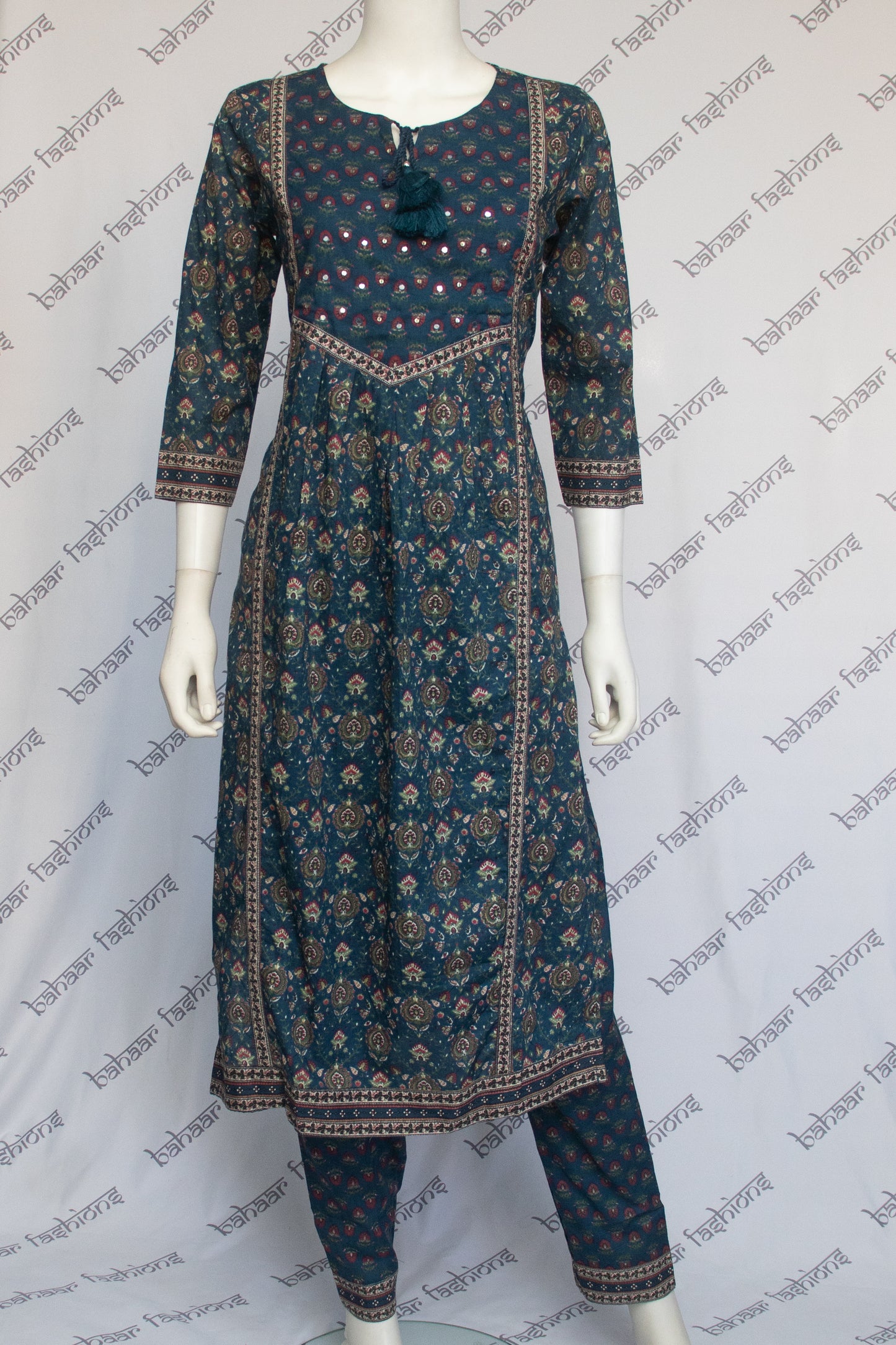 Stylish soft cotton suit featuring a beautiful floral block print with sequins work, paired with a matching cotton dupatta. Comfortable fit with a pocket in pants, perfect for simple, everyday elegance.