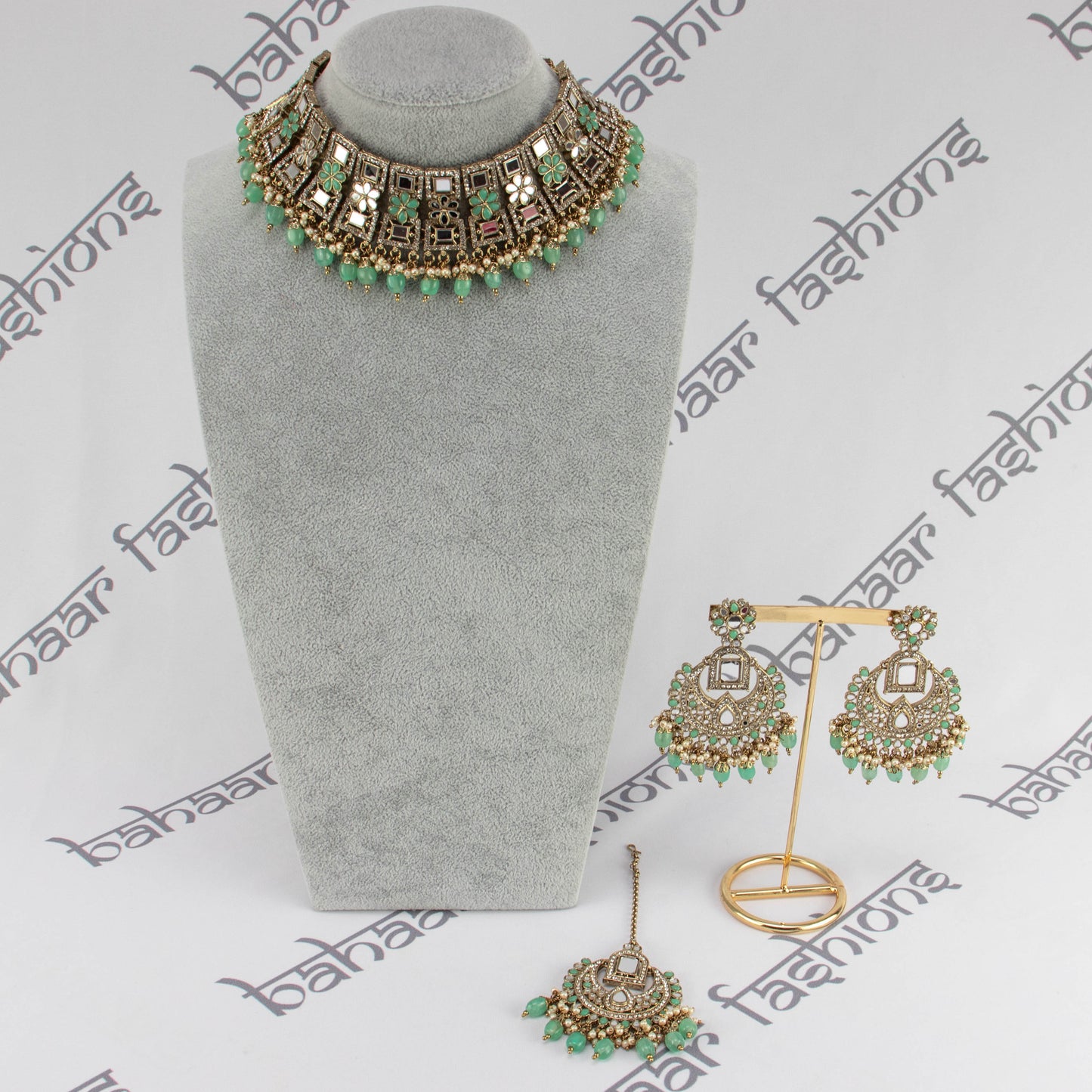 Regular price $36.50Stunning choker tikka set embellished with mirrors and mint green beads. A beautiful statement piece.