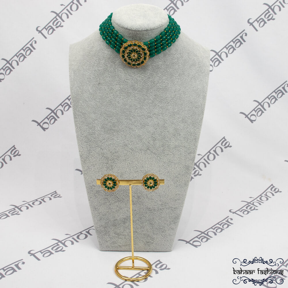Regular price $12.50Stunning choker set paired with stud earrings. It is beautifully embellished with emerald green beads and white and green rhinestones. A very classy piece to own.