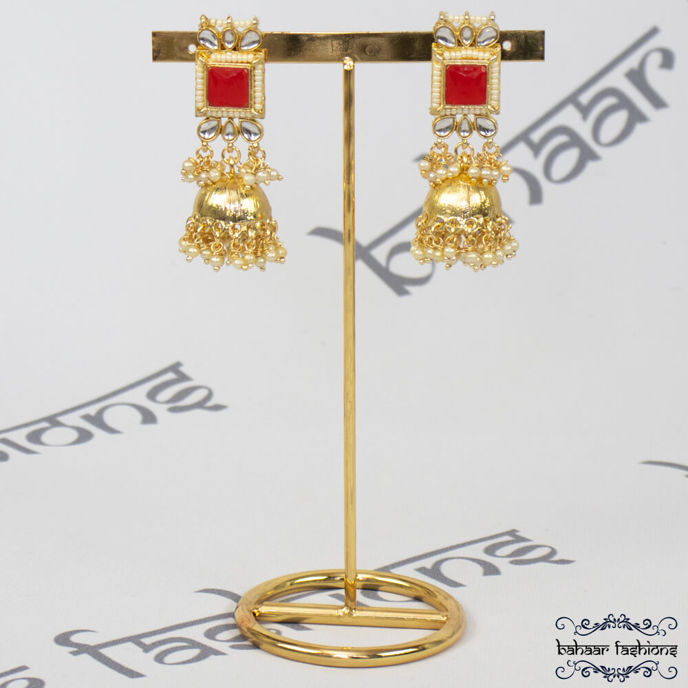 The earrings are approximately 2.5 inches in length and jhumkis are approximately 1 inch in diameter.