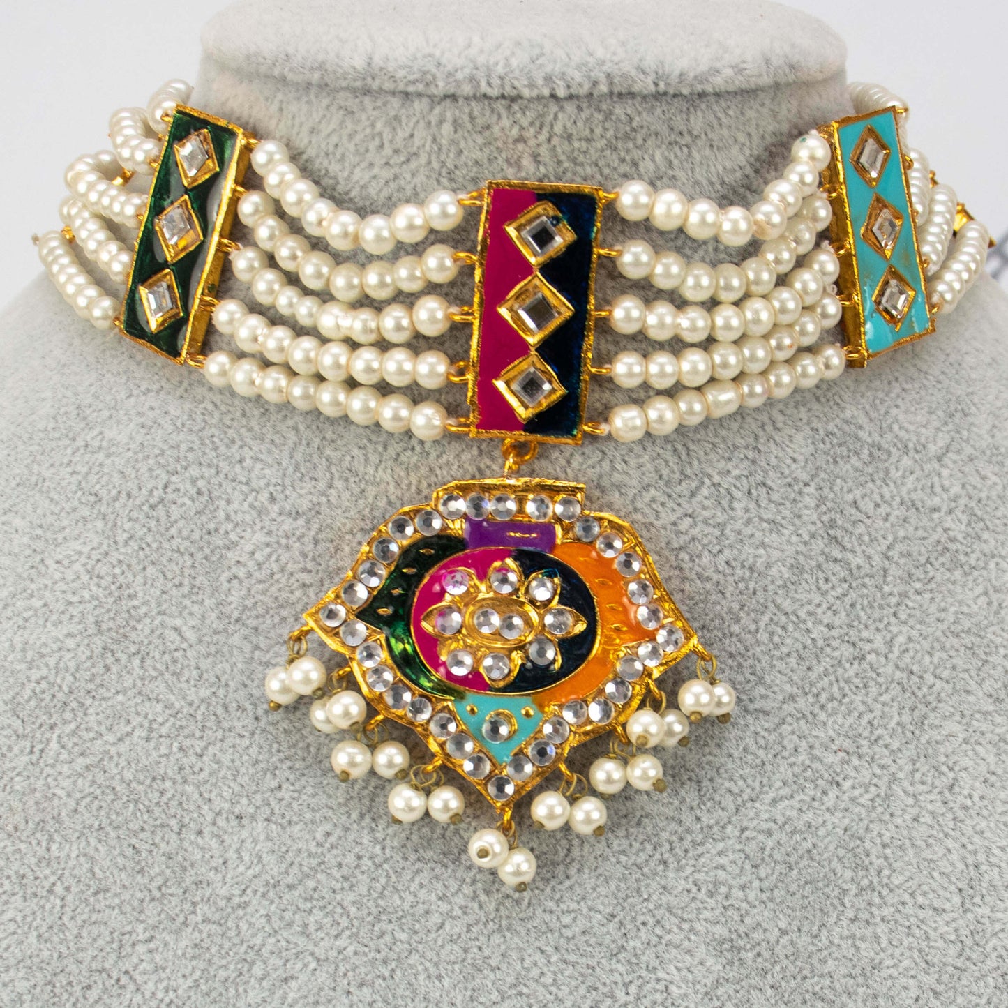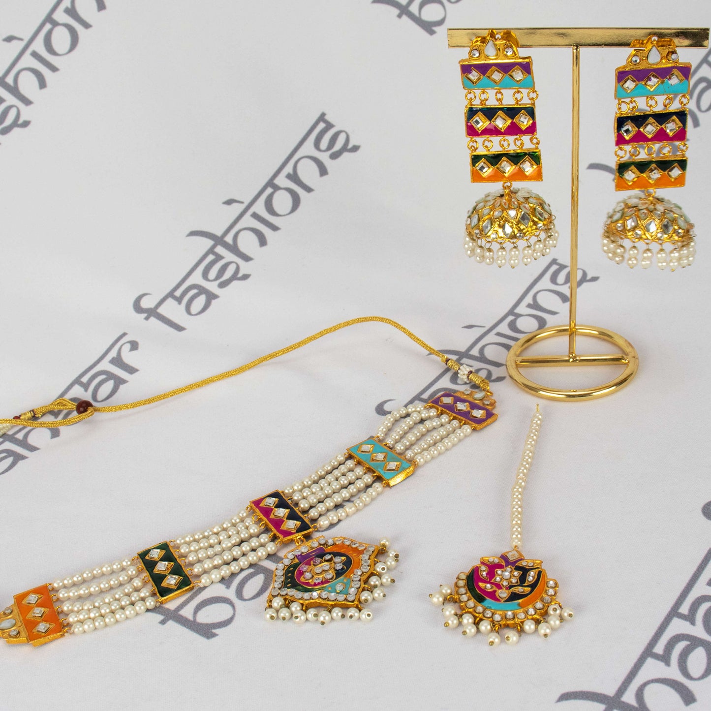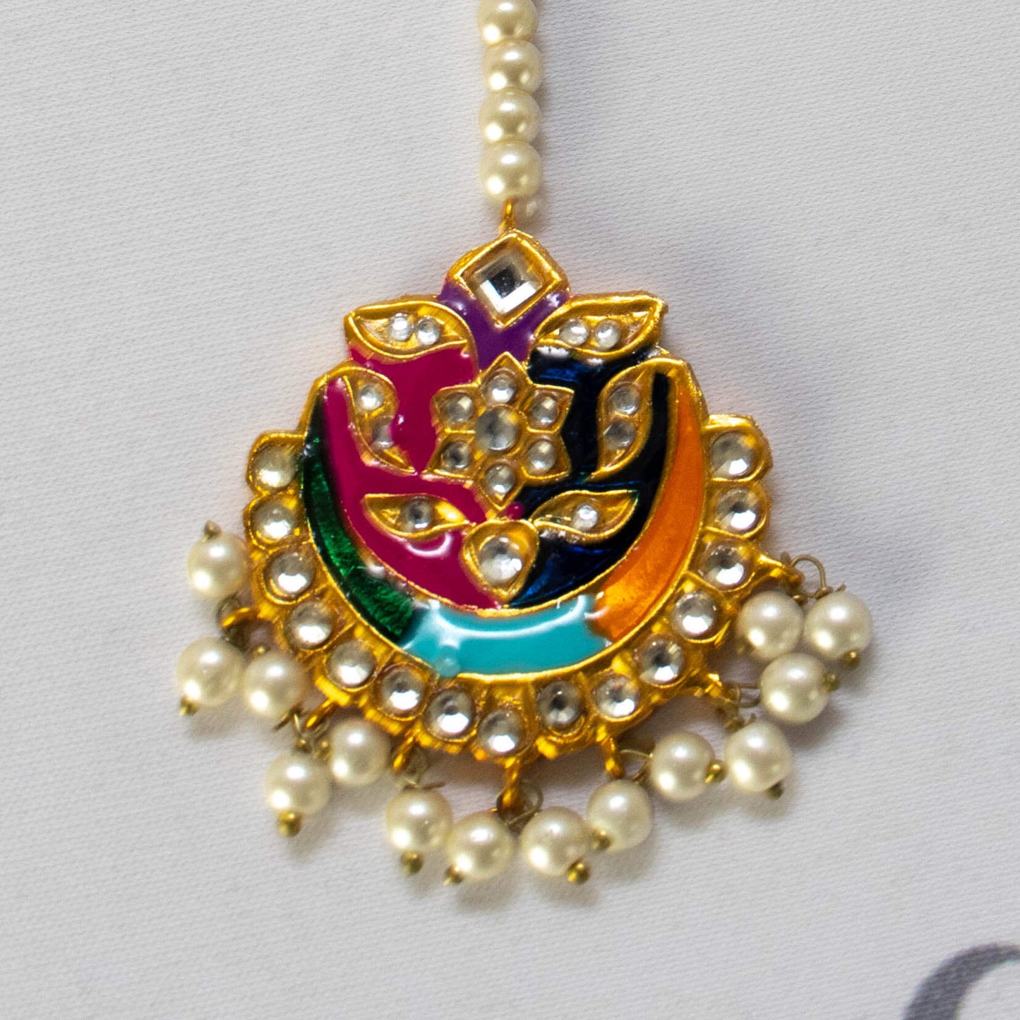 Regular price $32.50Exquisite thappa meenakari choker, jhumki, and tikka embellished with pearl beads, rhinestones and mirrors.