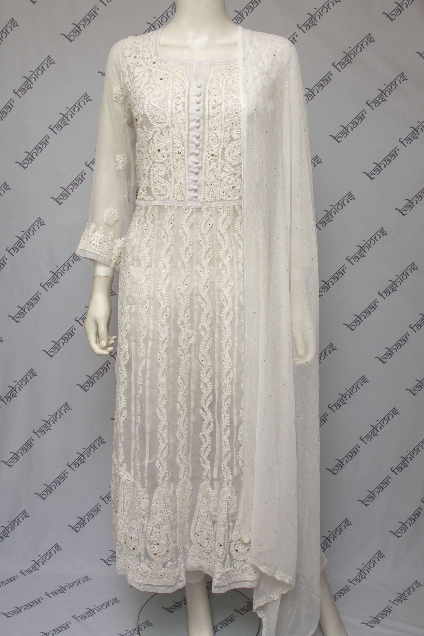 Regular price $25.00White long anarkali georgette kurti with intricate lucknowi chikankari embroidery paired with a beautiful chiffon dupatta. The dupatta and the kurti are embellished with mukaish (metallic embroidery) work.