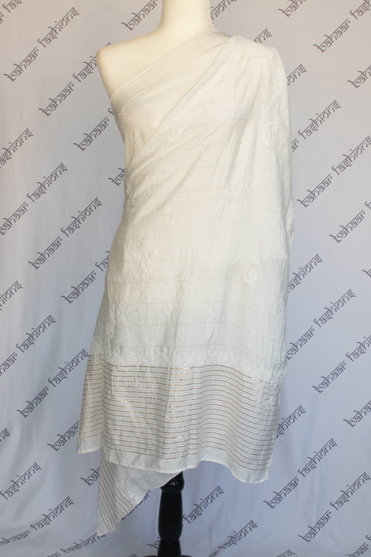 White cotton dupatta with intricate paisley thread work, highlighted with delicate golden wire detailing. A timeless piece that adds elegance to any outfit.