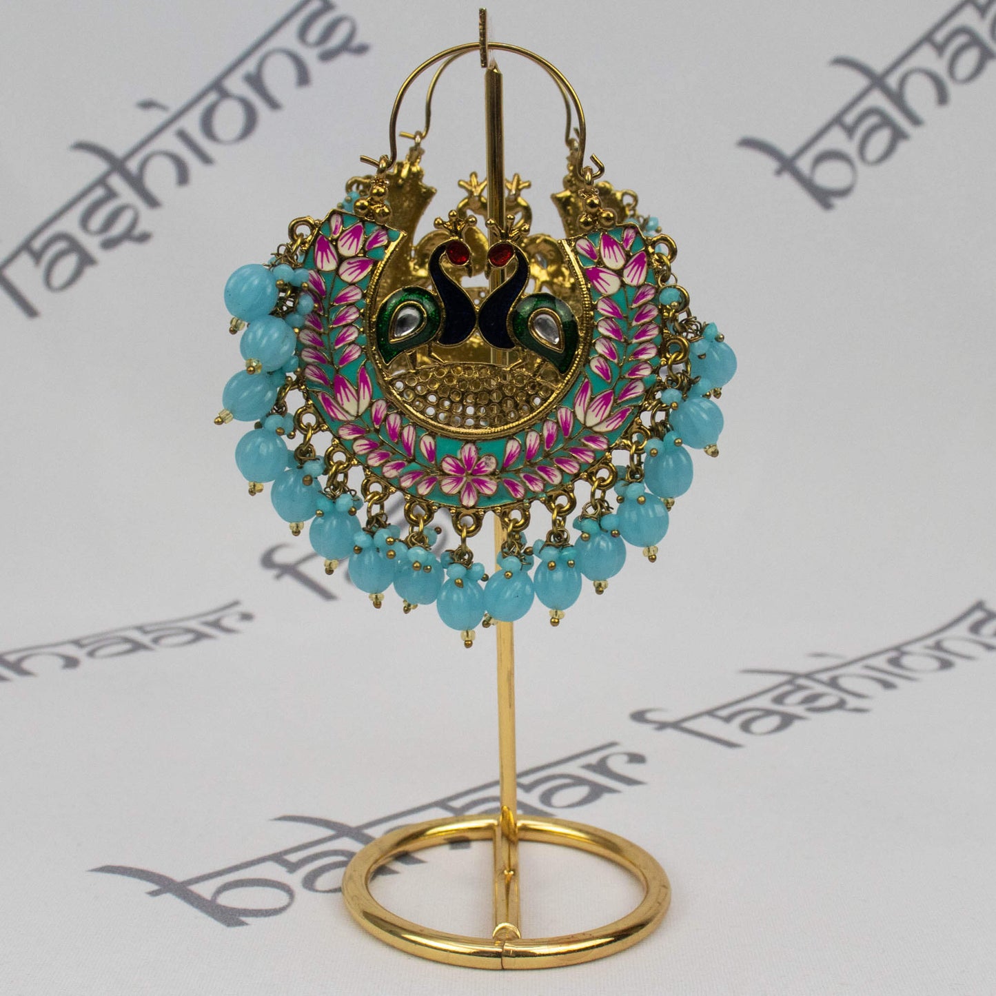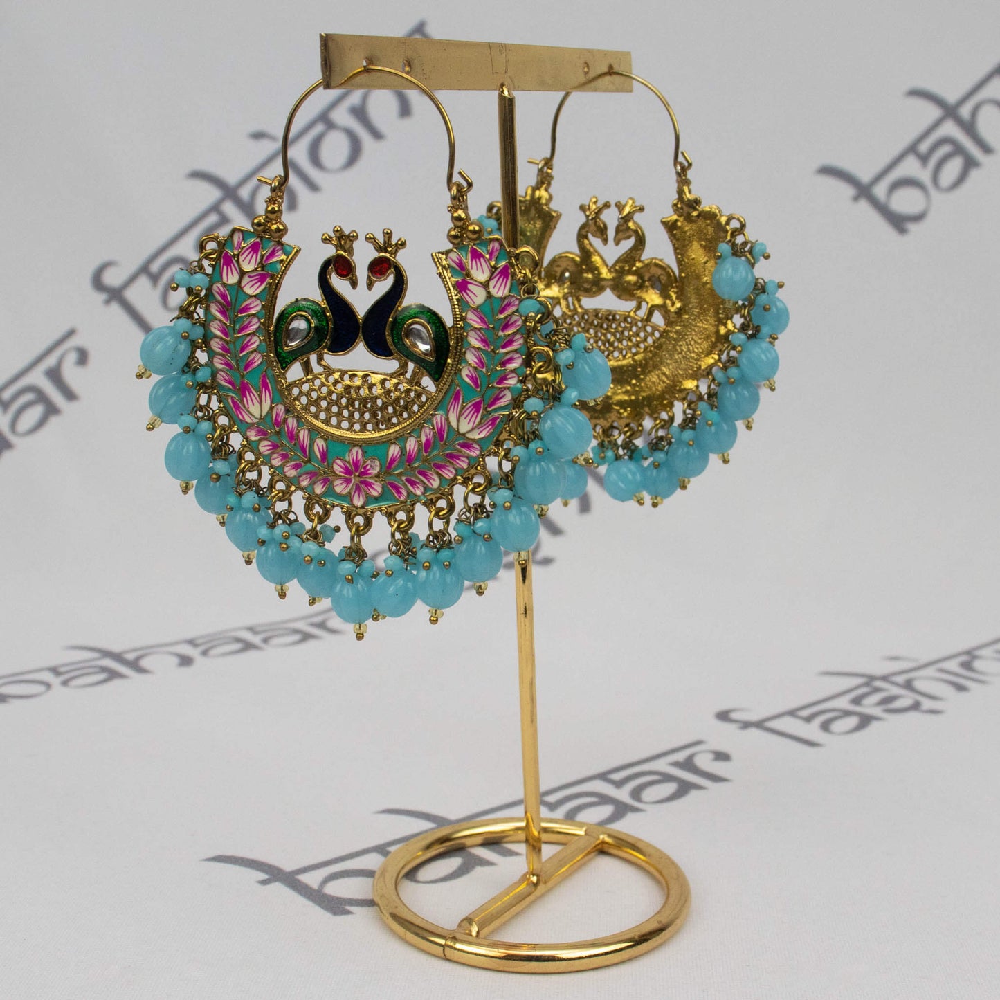 Regular price $22.00Beautiful meenakari chandbali earrings embellished with peacock design and baby blue beads.