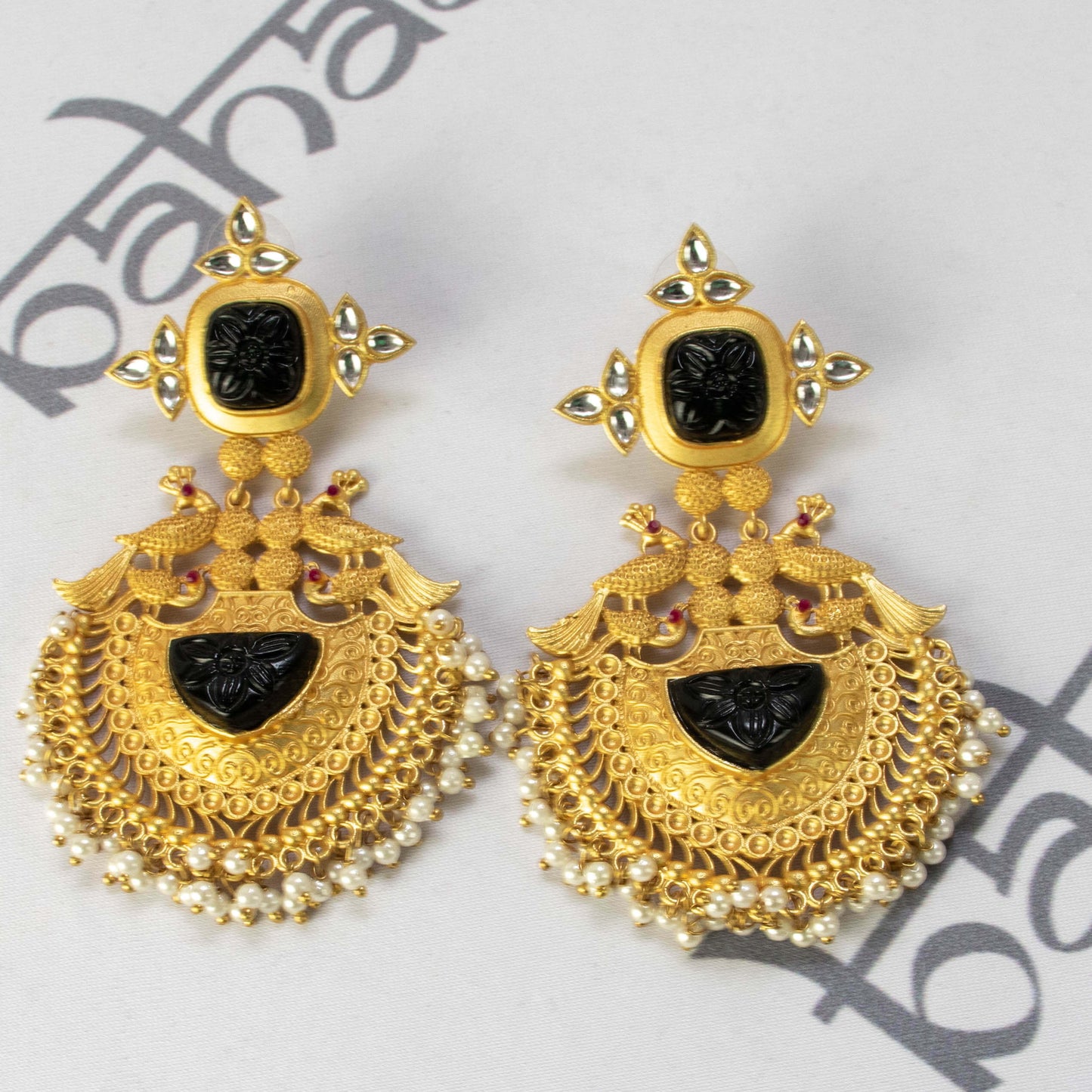 Regular price $13.50Exquisite peacock design earrings embellished with Monalisa stones, kundan stones, and pearls.