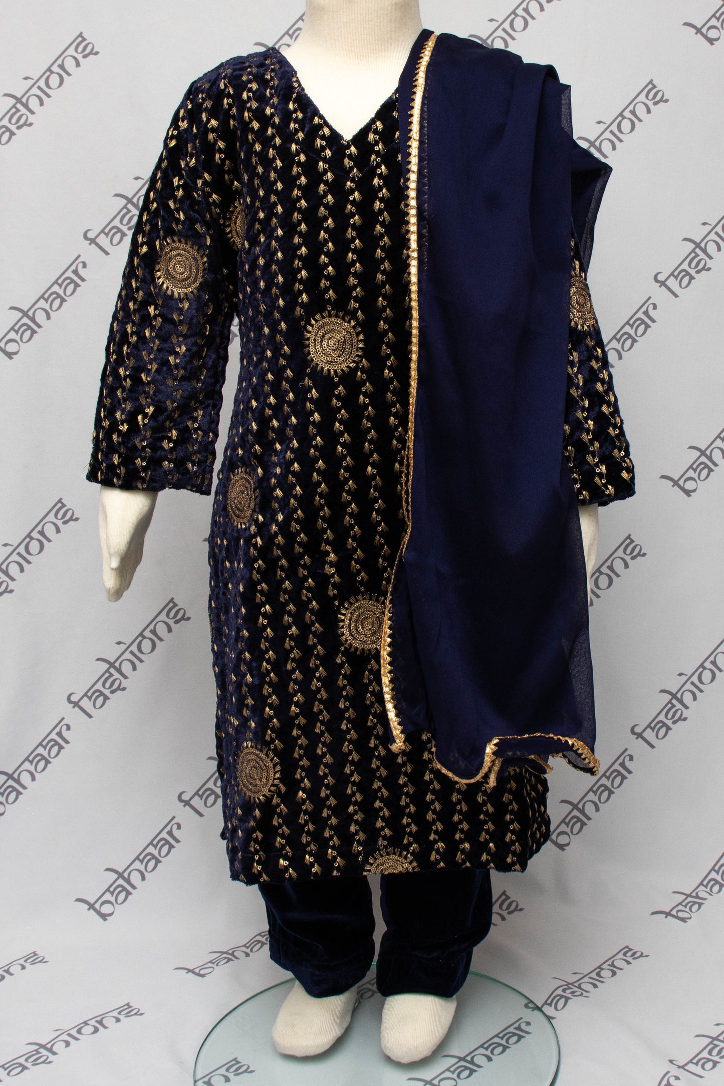 Regular price $27.50Loose and comfortable fit long-sleeved velvet suit paired with a chinnon dupatta with gotta lace. The kameez is embellished with sequin work with plain velvet pants.