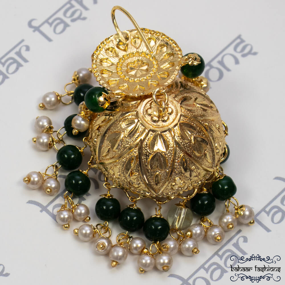 Regular price $15.00Traditional golden tikka set paired with jhumki earrings and decorated with dark green and white beads. This is a very lightweight tikka set, weighing only 34 grams.