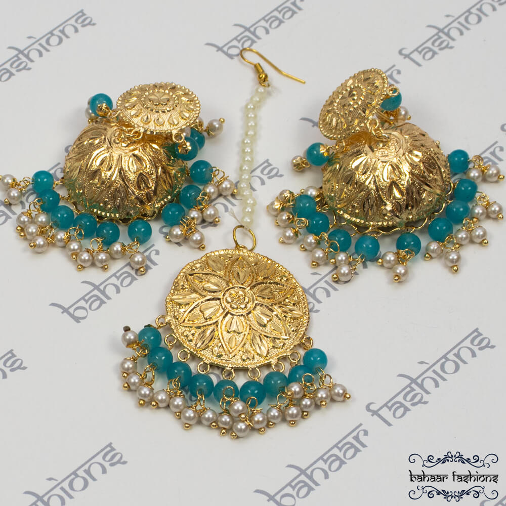 Regular price $15.00Traditional golden tikka set paired with jhumki earrings and decorated with turquoise and white beads. This is a very lightweight tikka set, weighing only 34 grams.