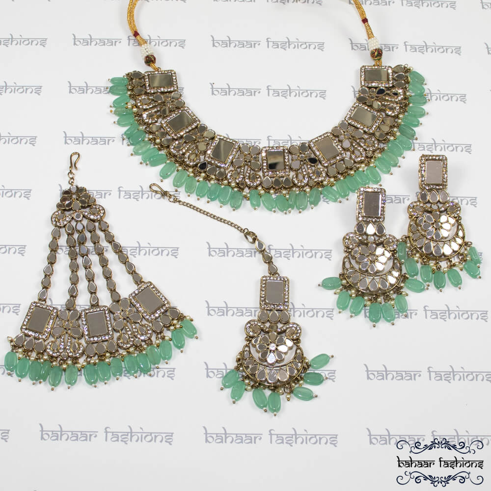 Regular price $55.00Radiant mirror necklace set. The necklace set includes a passa, a tikka, and earrings embellished with mint green beads. This necklace set is all mirror work.