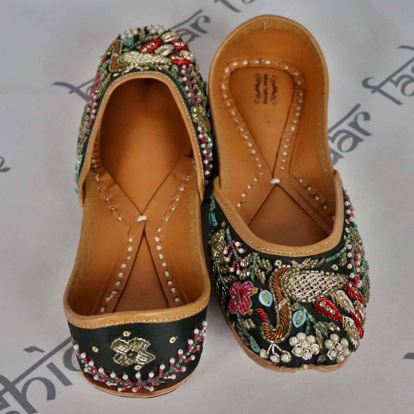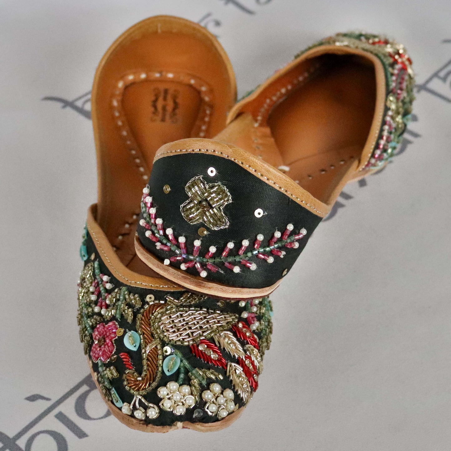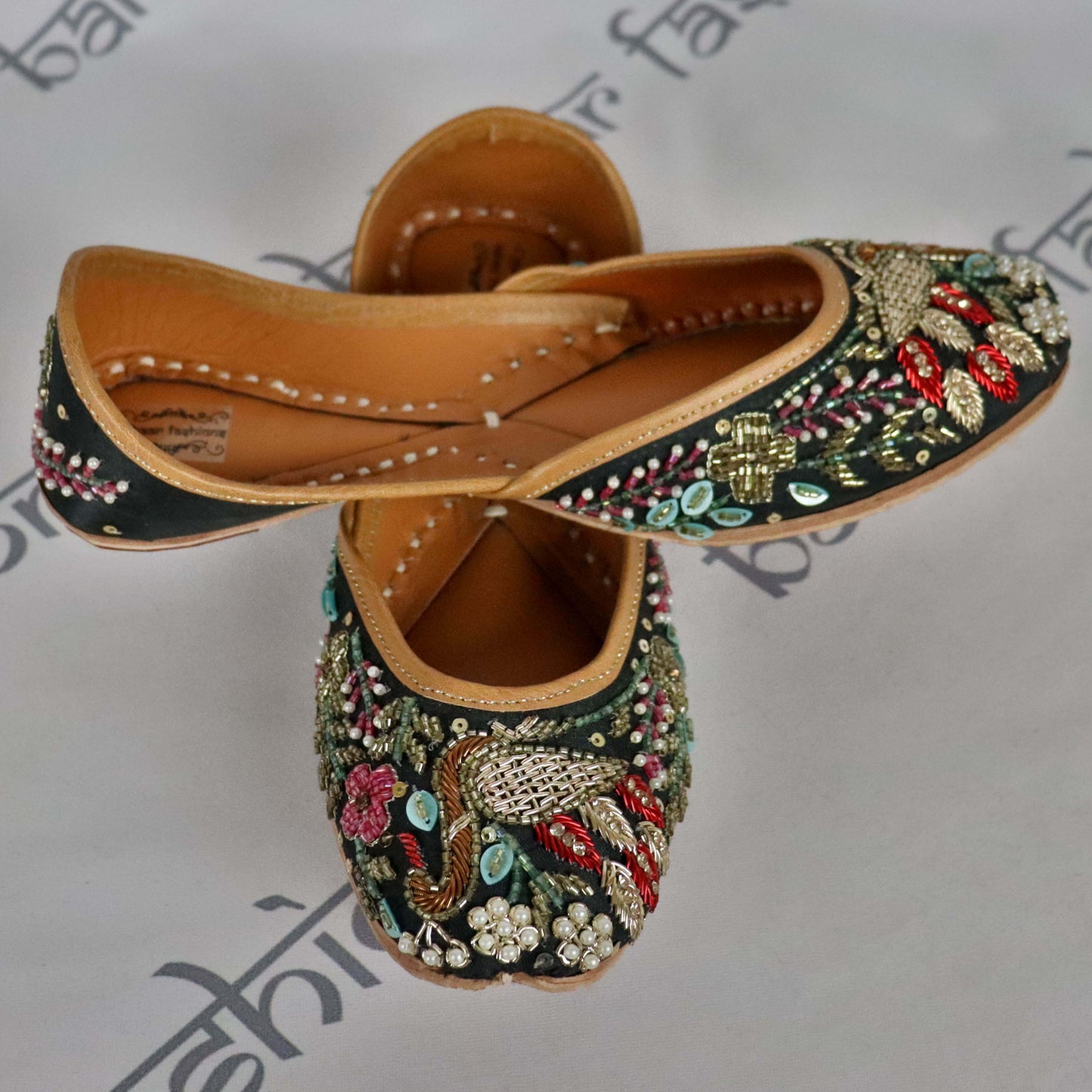 Regular price $13.50Exquisite peacock design black punjabi jutti embellished with intricate beaded and rhinestone work. The interior is made of genuine leather with a double cushion making the jutti very comfortable to wear.