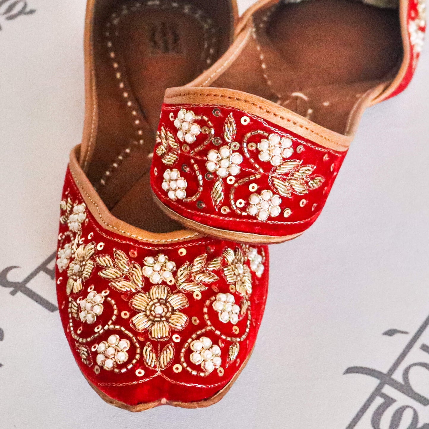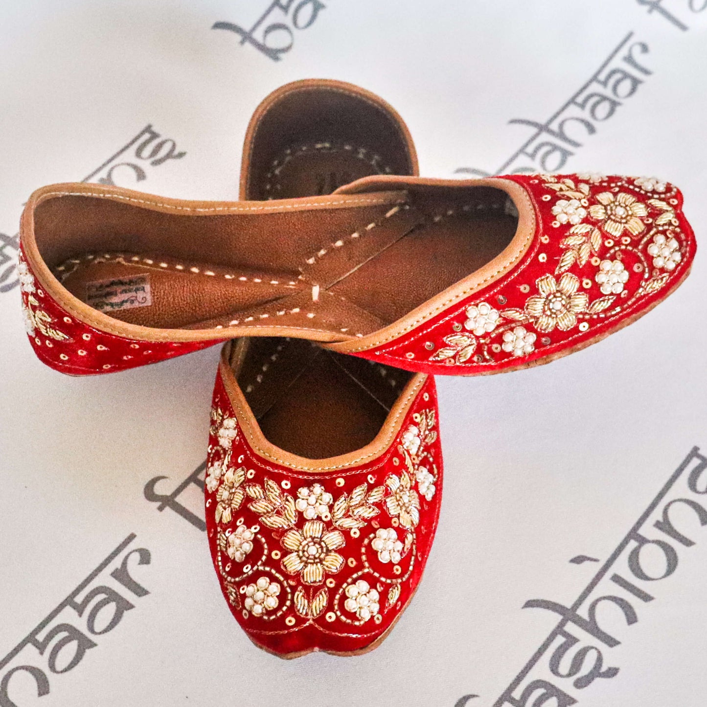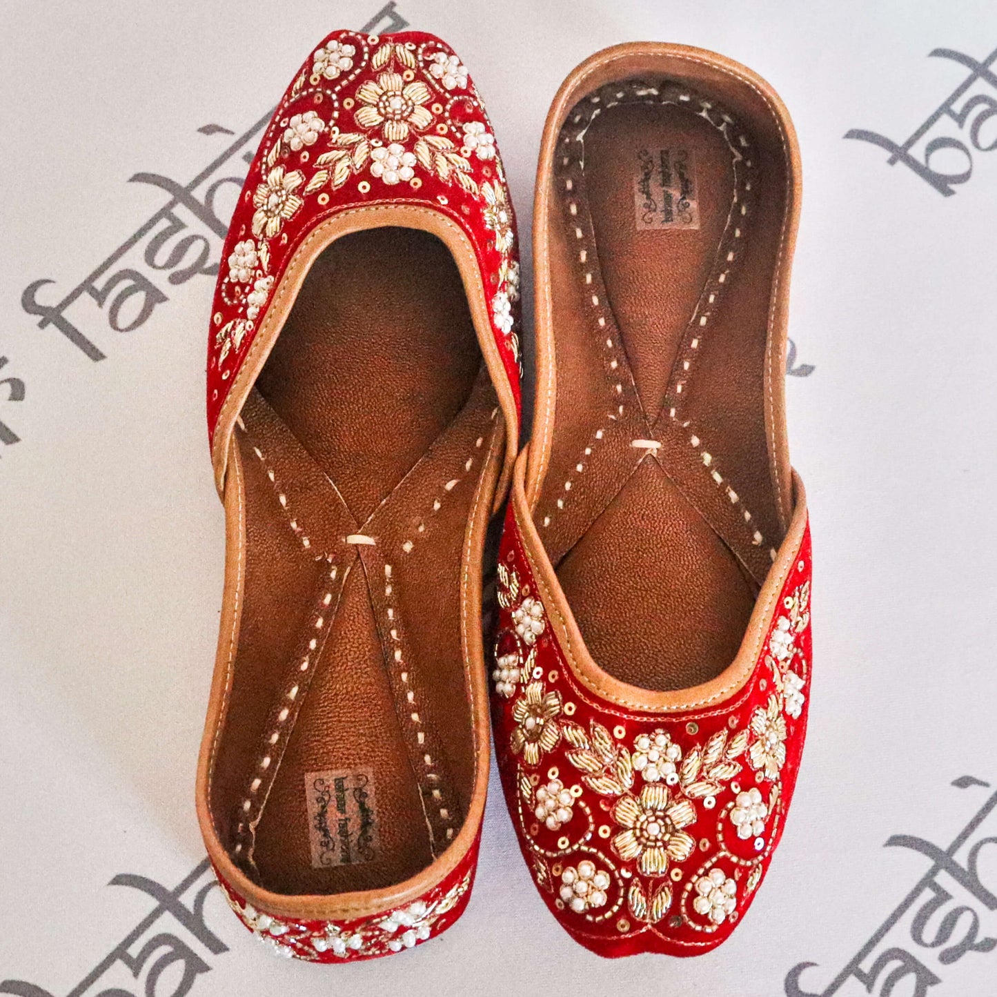 Exquisite red jutti embellished with intricate zardozi and beaded work. The interior is made of genuine leather with a double cushion, making the jutti very comfortable to wear.