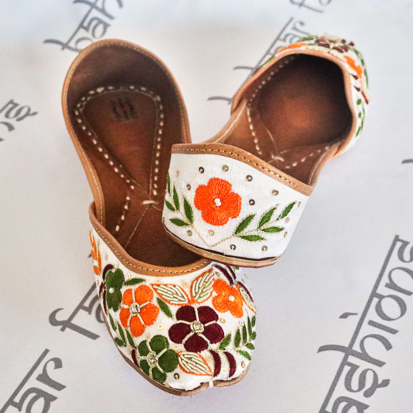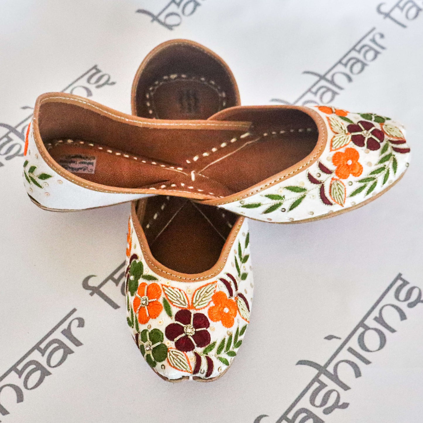 Beautiful white jutti with intricate floral thread embroidery and sequin work. The interior is made of genuine leather with a double cushion, making the jutti very comfortable to wear.