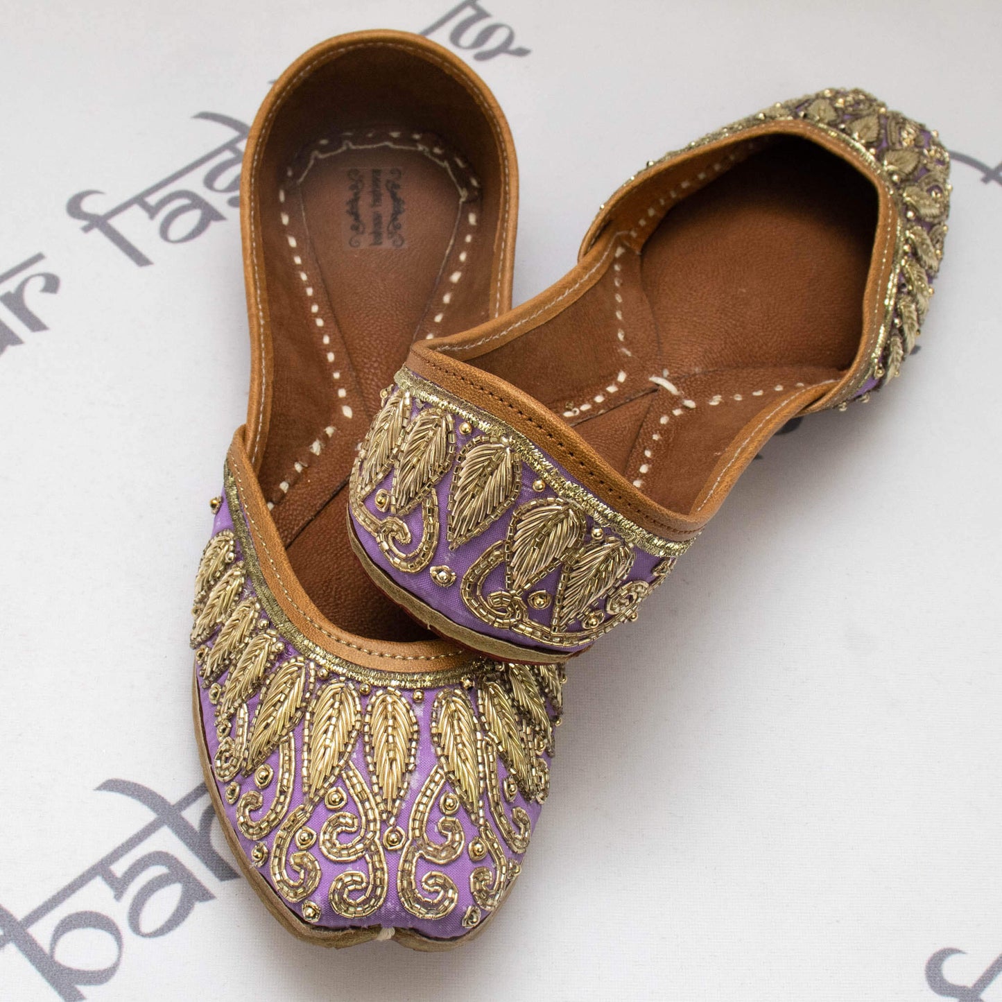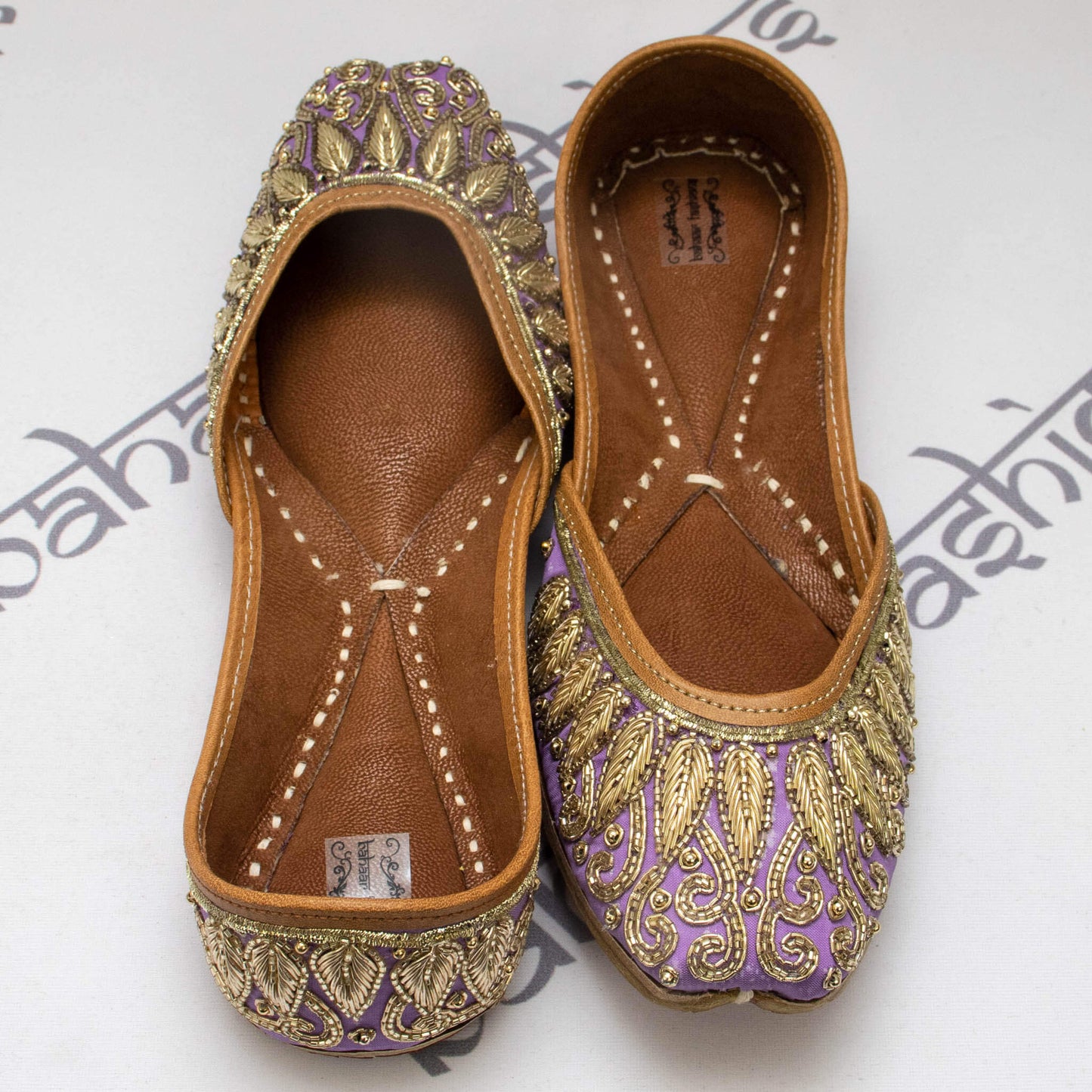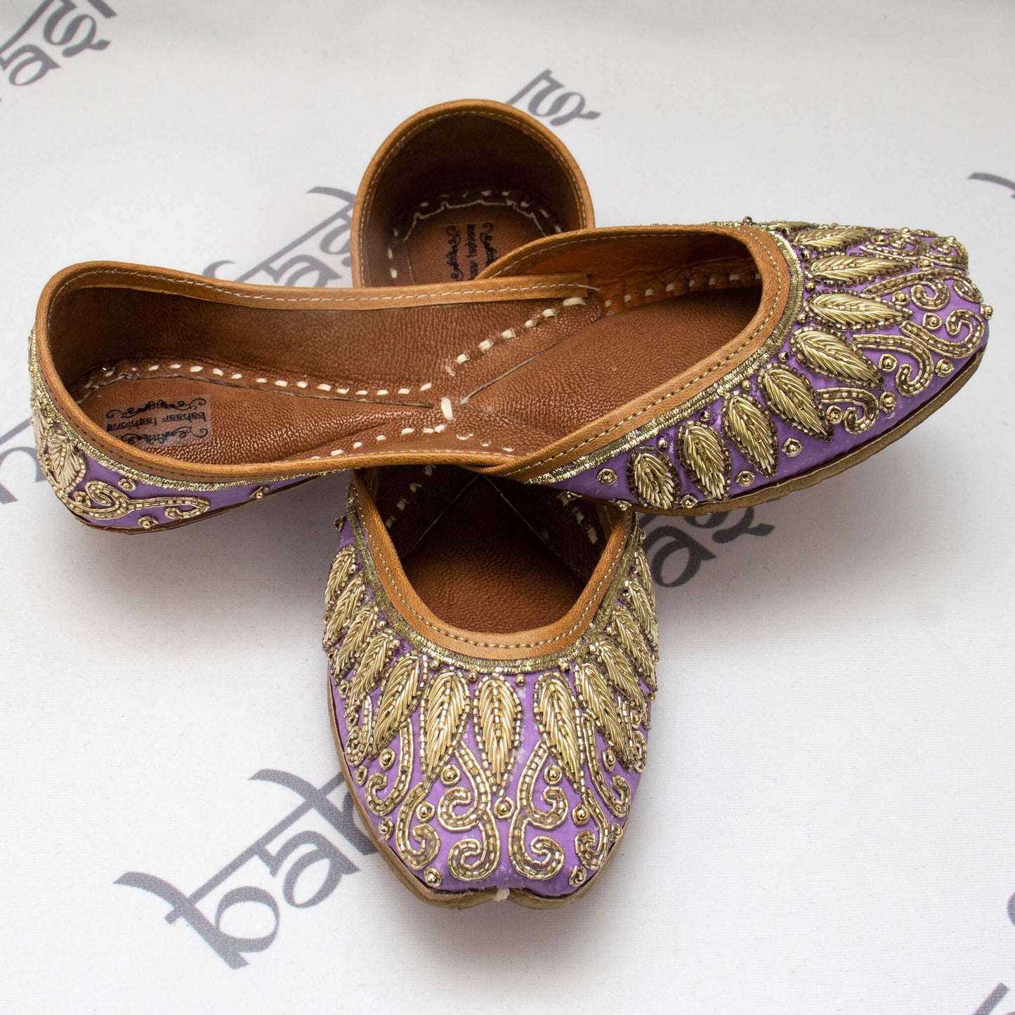 Regular price $15.00Exquisite lilac punjabi jutti embellished with intricate zardozi embroidery. The interior is made of genuine leather with a double cushion making the jutti very comfortable to wear.
