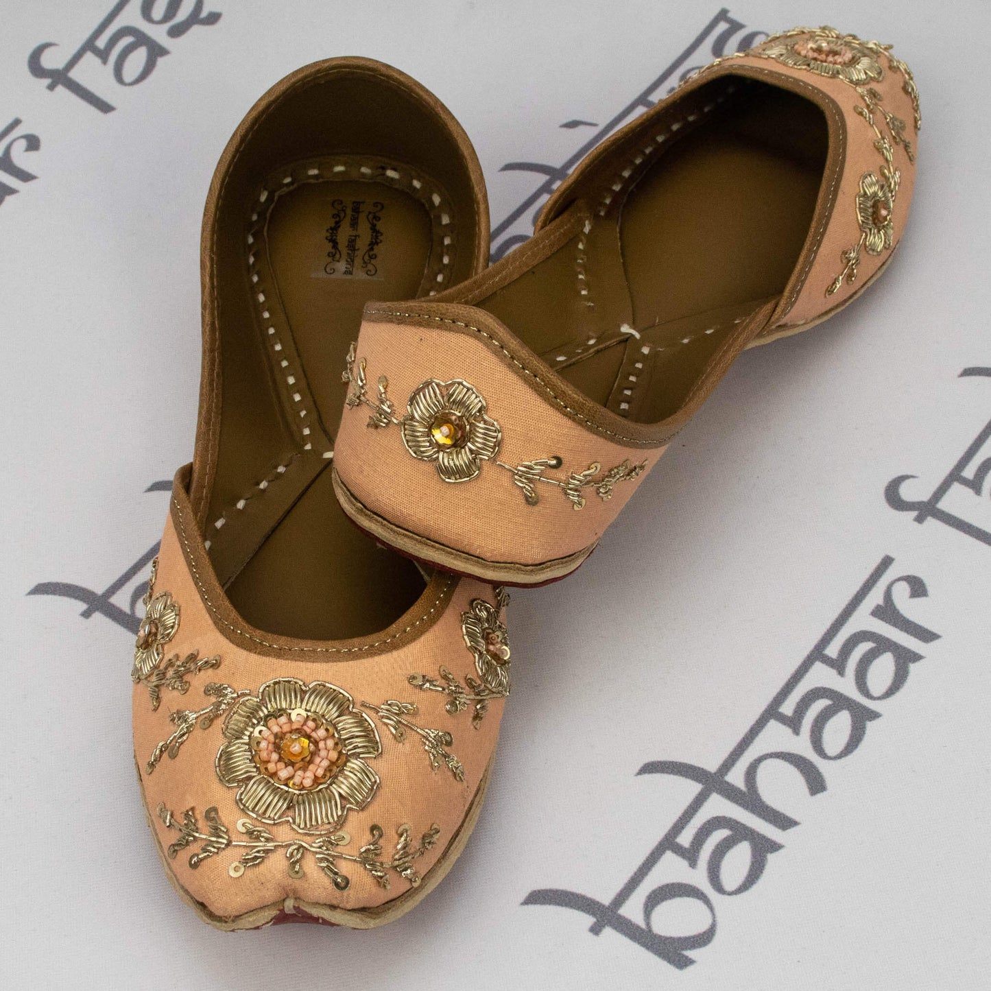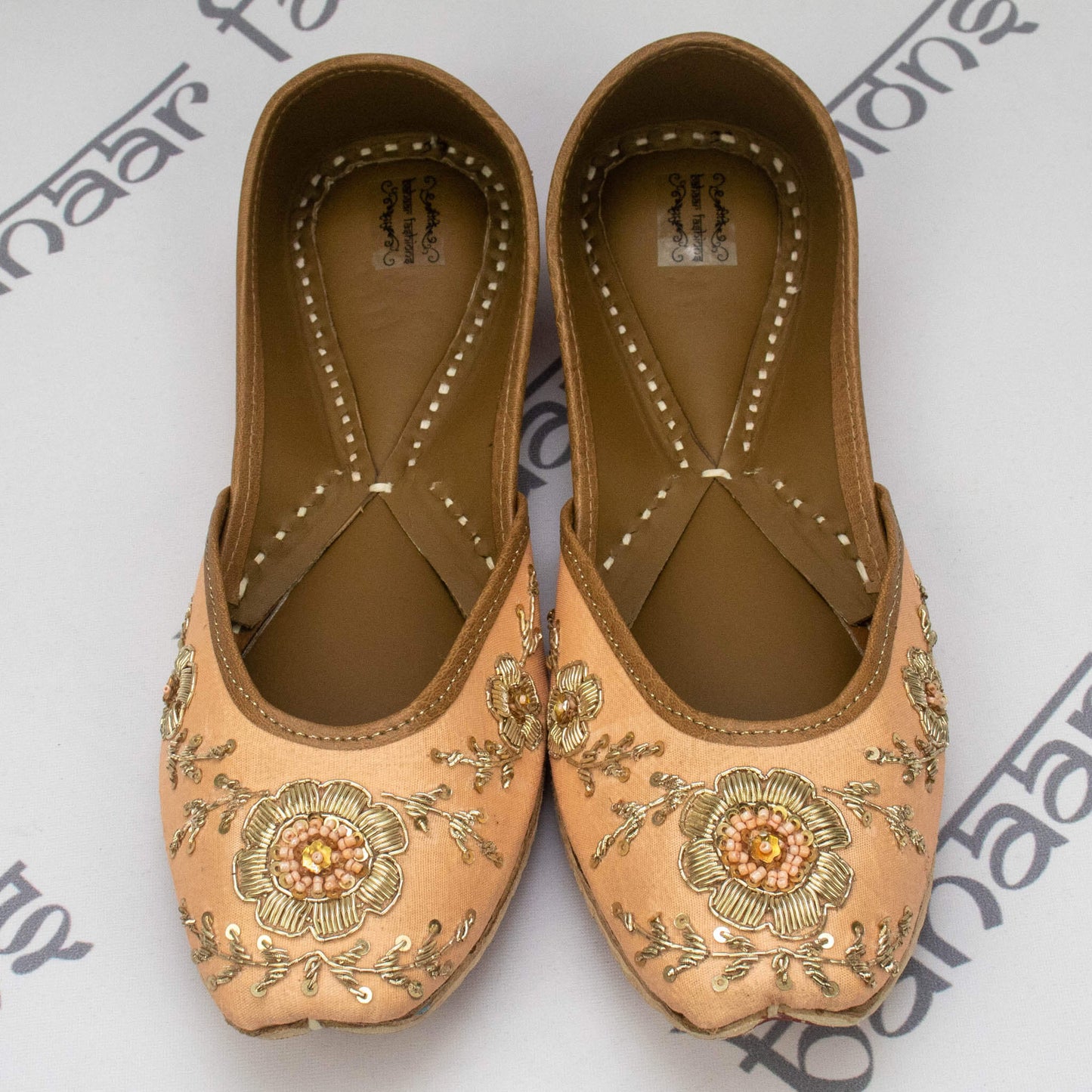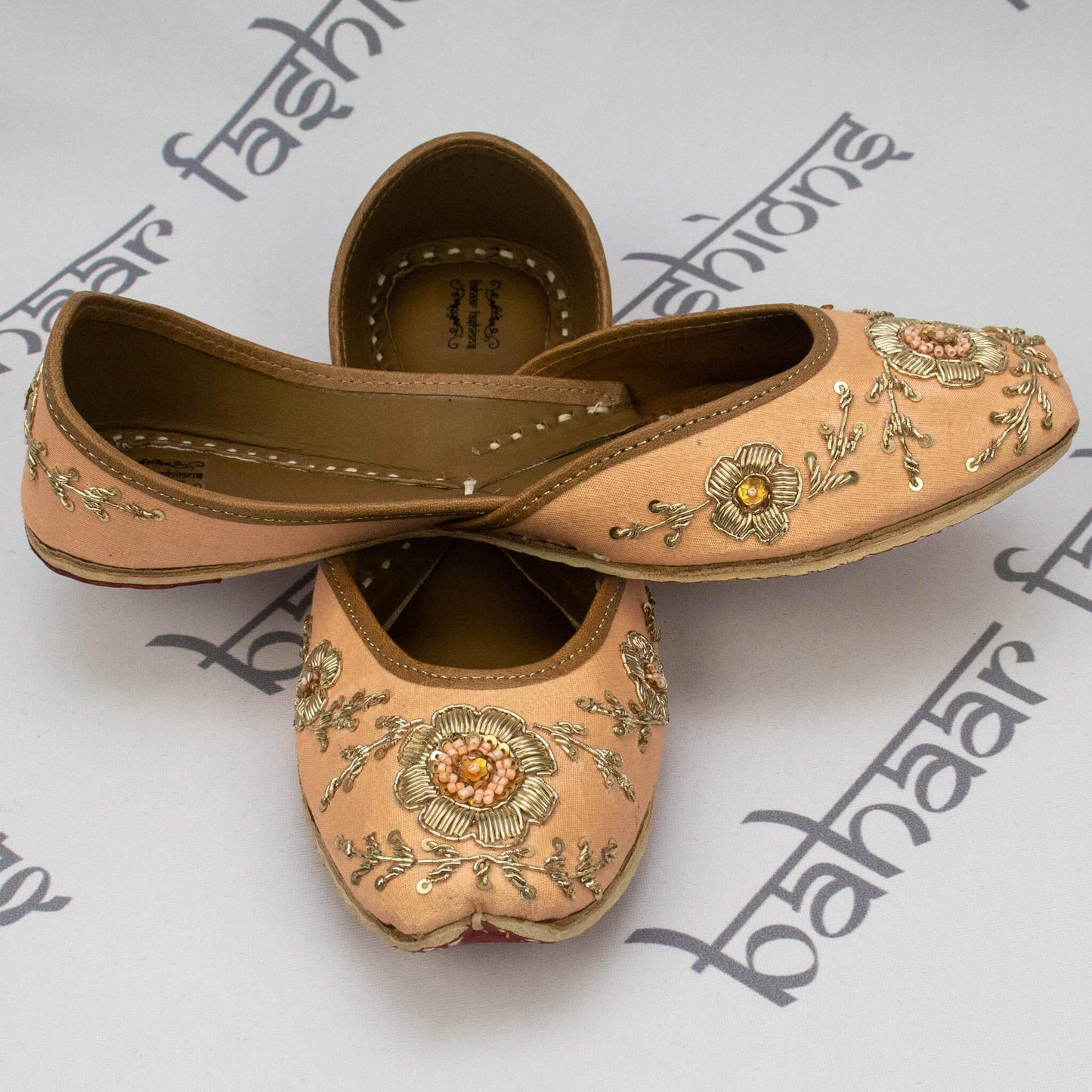 Regular price $13.50Exquisite peach punjabi jutti embellished with intricate zardozi embroidery. The interior is made of genuine leather with a double cushion making the jutti very comfortable to wear.