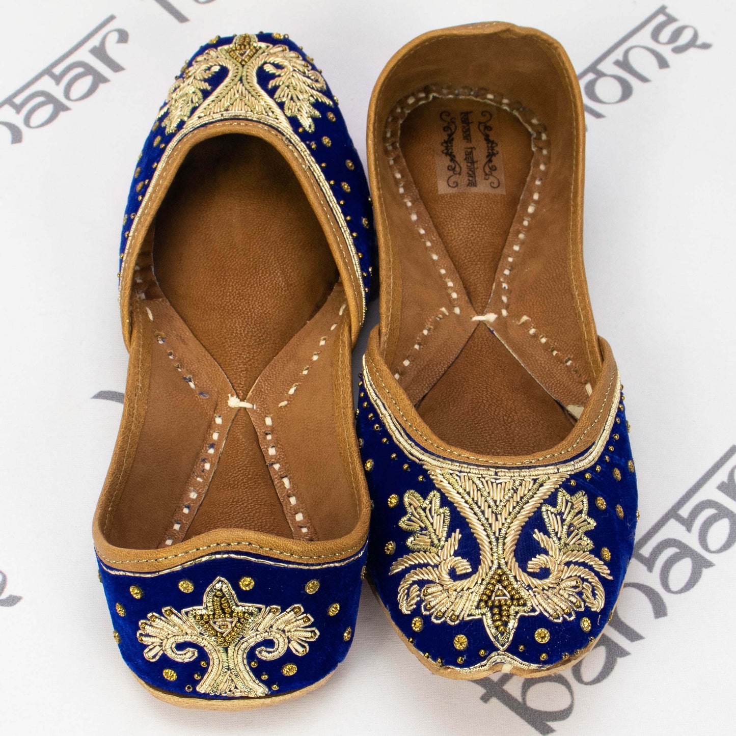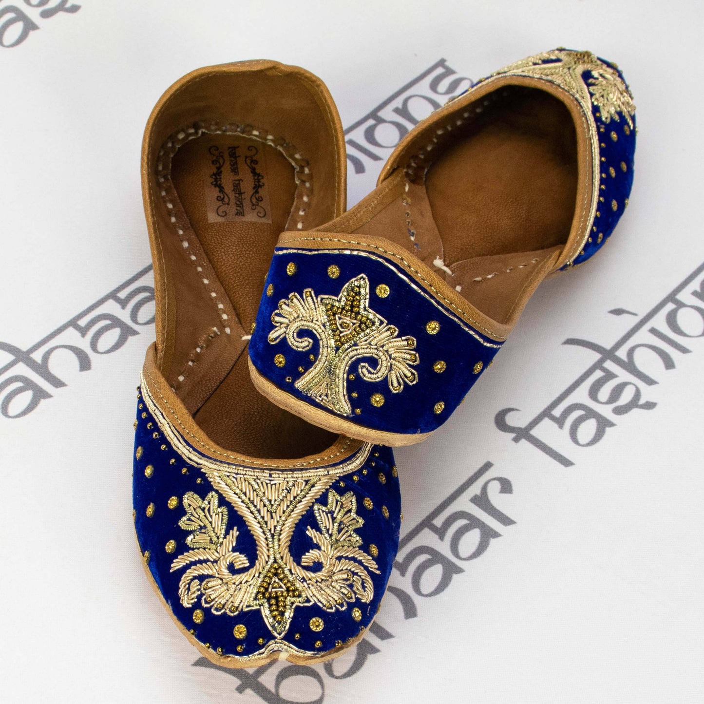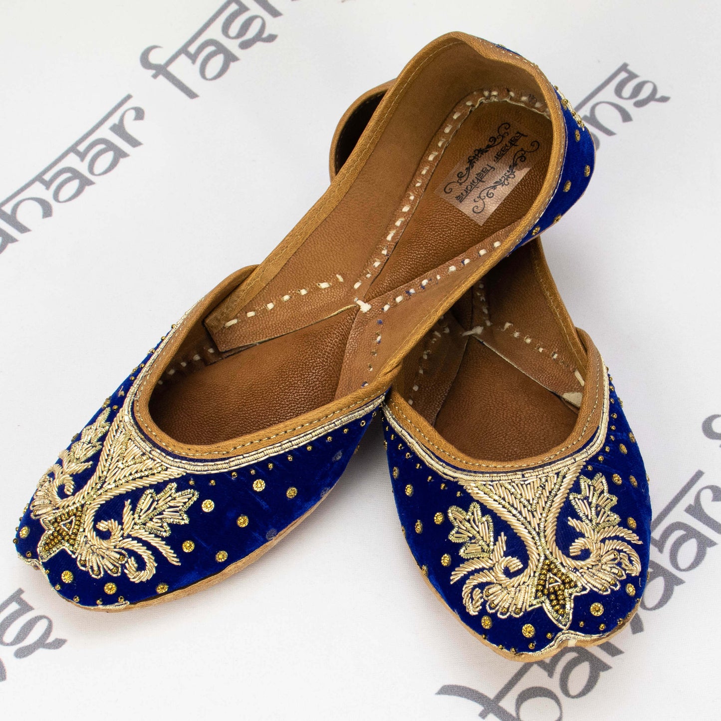 Regular price $10.00Beautiful royal blue velvet punjabi jutti embellished with intricate zardozi embroidery. The interior is made of genuine leather with a double cushion making the jutti very comfortable to wear.