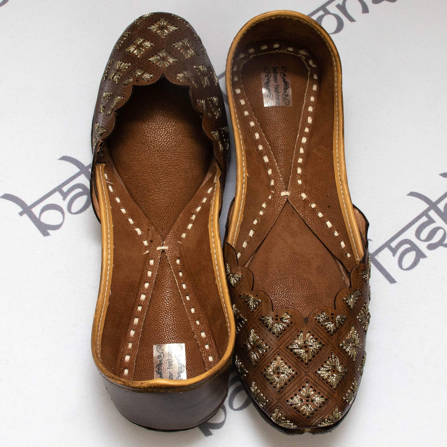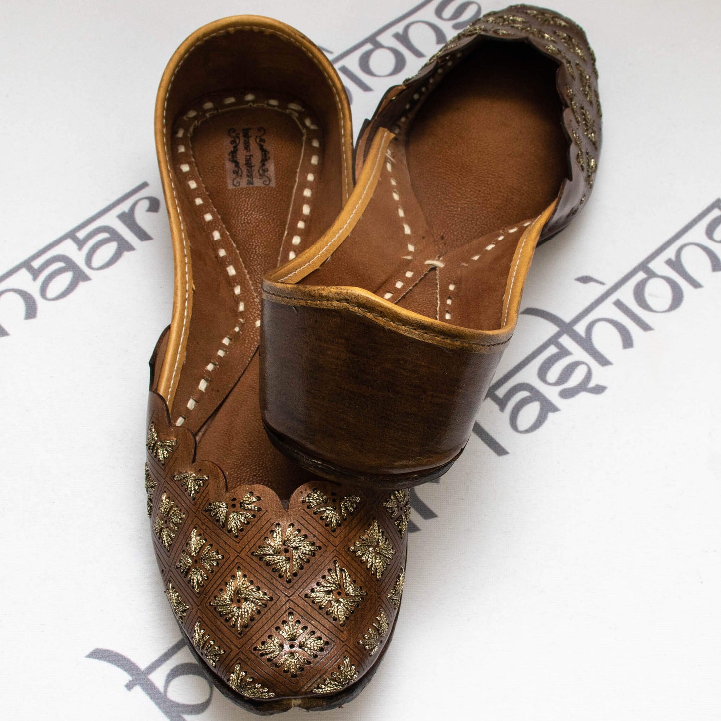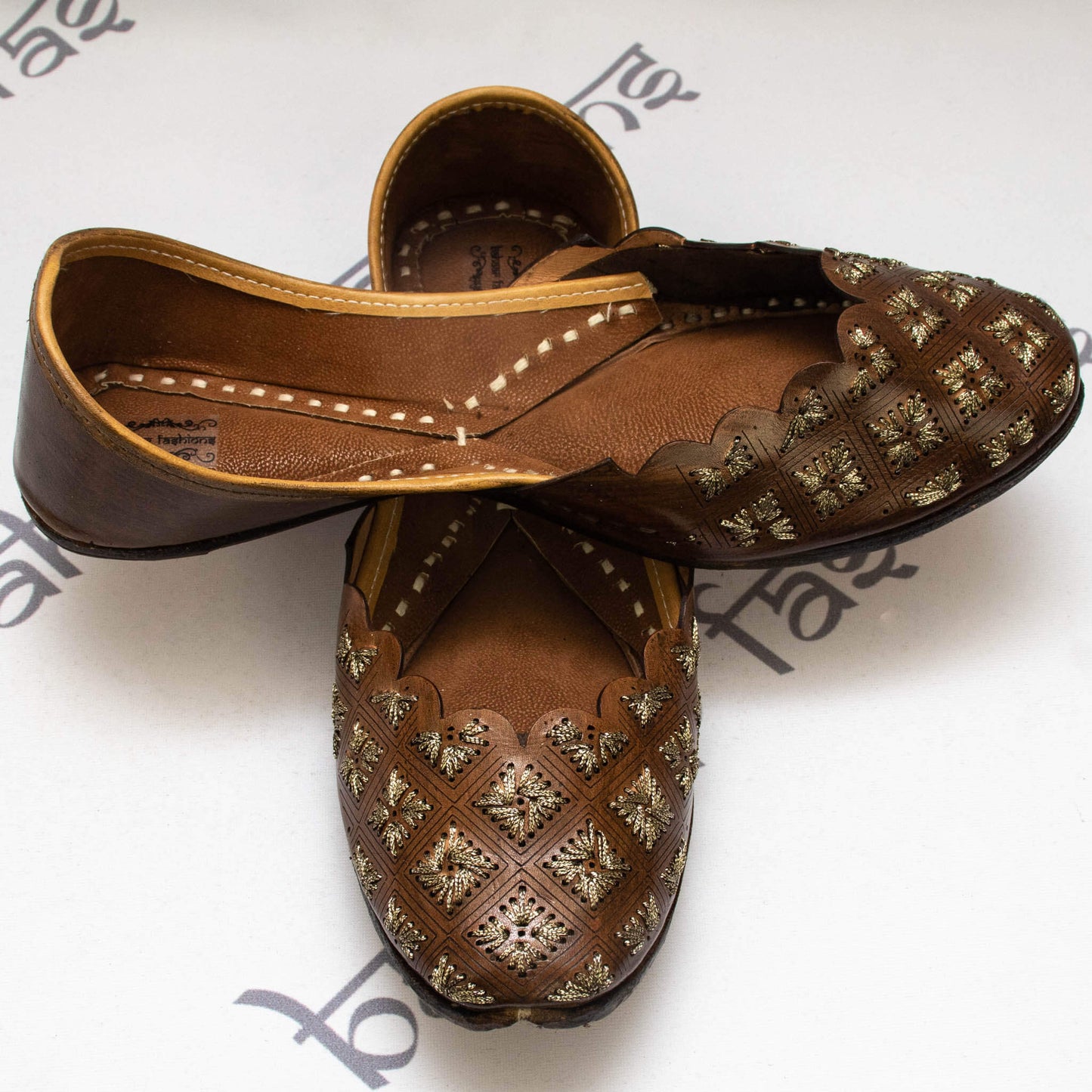 Regular price $10.00Casual scalloped design punjabi jutti beautifully handcrafted with intricate thread work. The interior is made of genuine leather with a double cushion making the jutti very comfortable to wear.