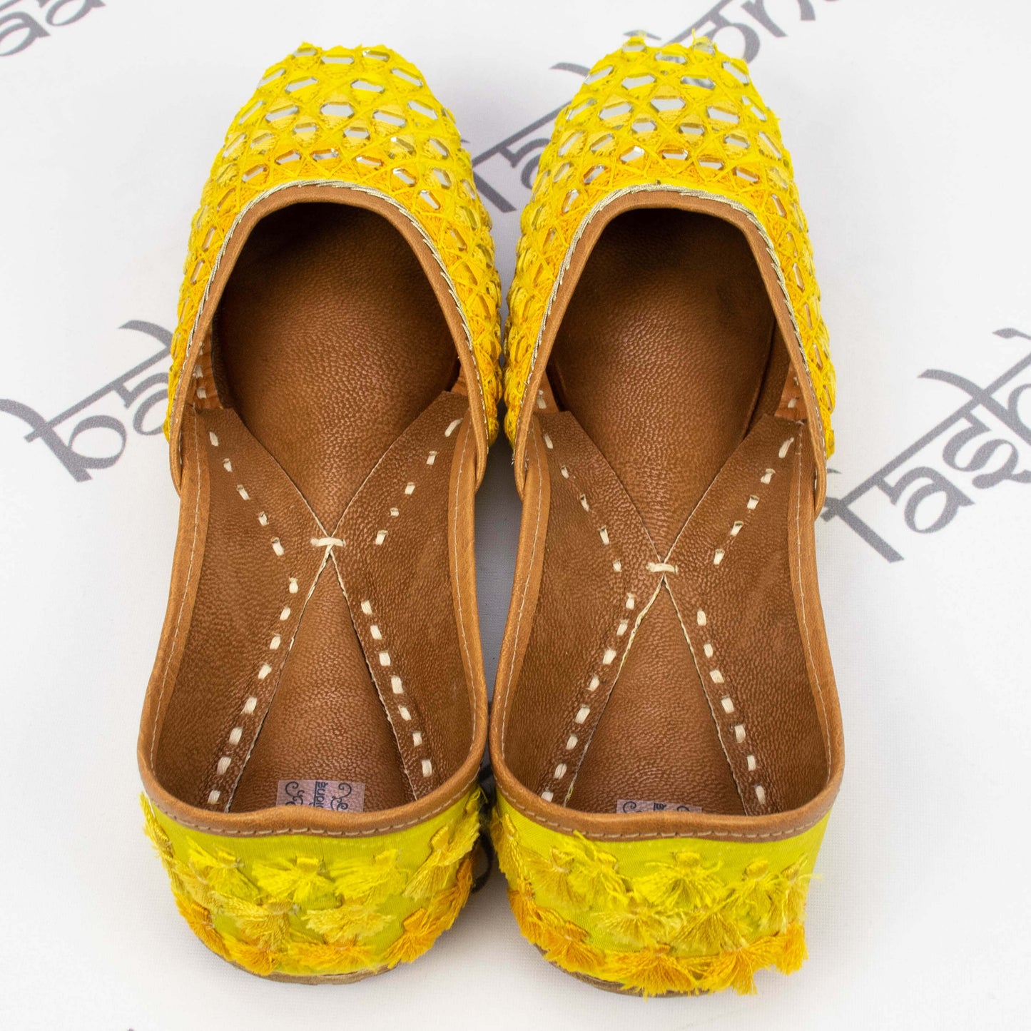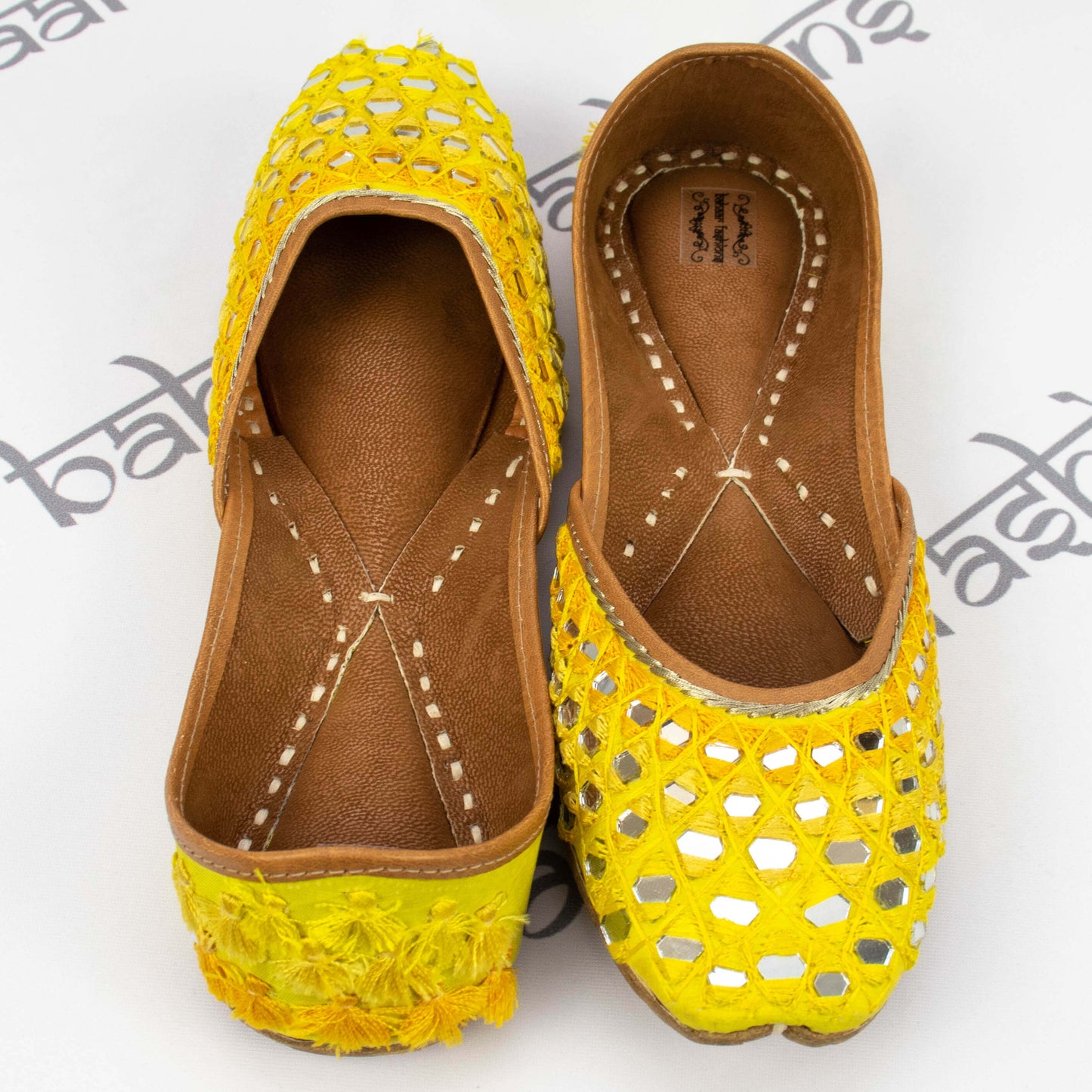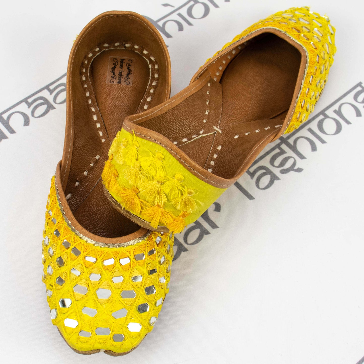 Regular price $8.50Yellow jutti beautifully handcrafted with thread and real mirror work. The interior is made of genuine leather making the jutti very comfortable to wear.