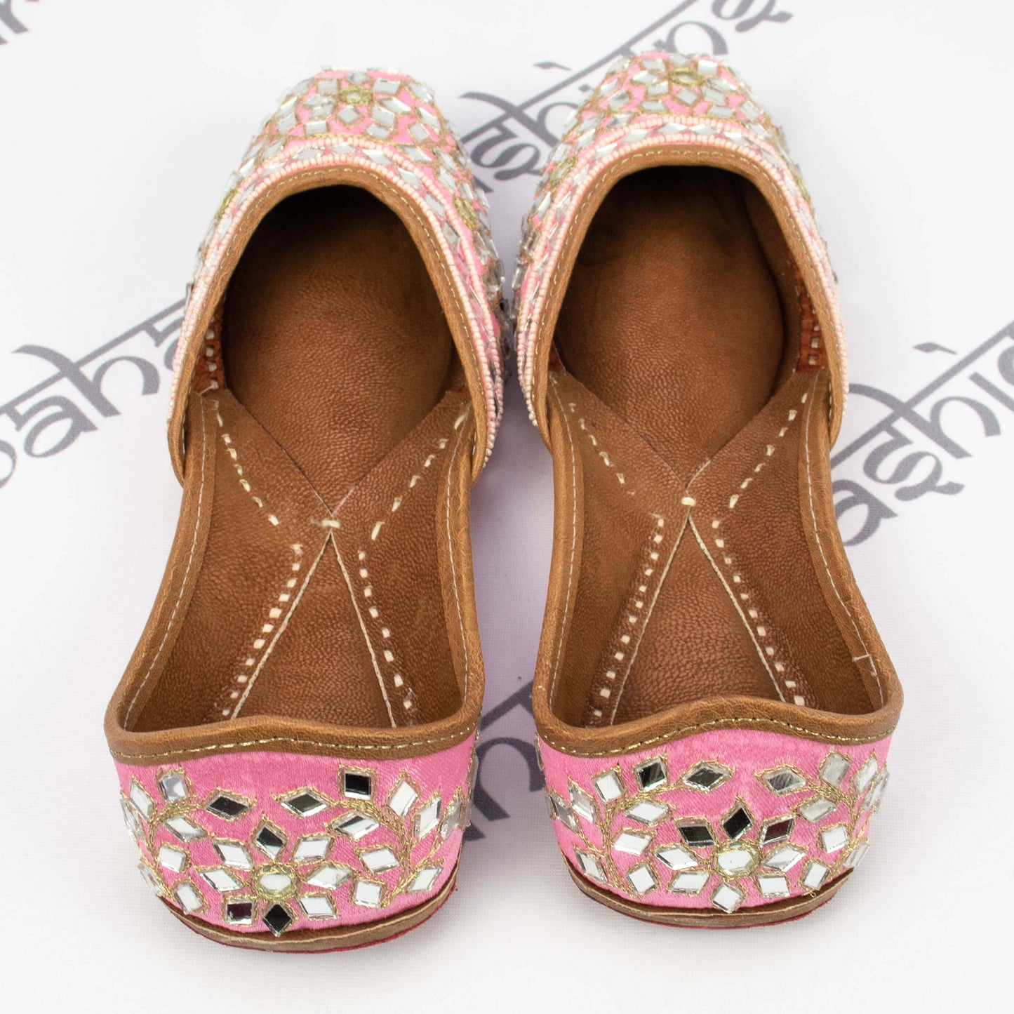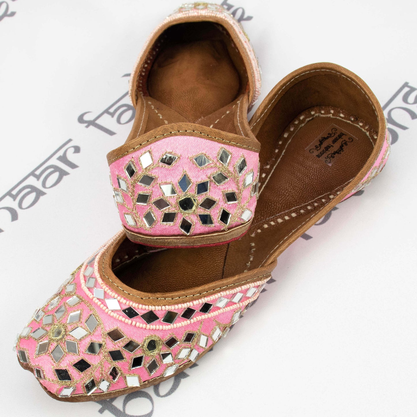 Regular price $12.50Pastel pink punjabi jutti beautifully handcrafted with real mirror work, dabka outlining, and embellished with pastel pink beads. The interior is made of genuine leather making the jutti very comfortable to wear.