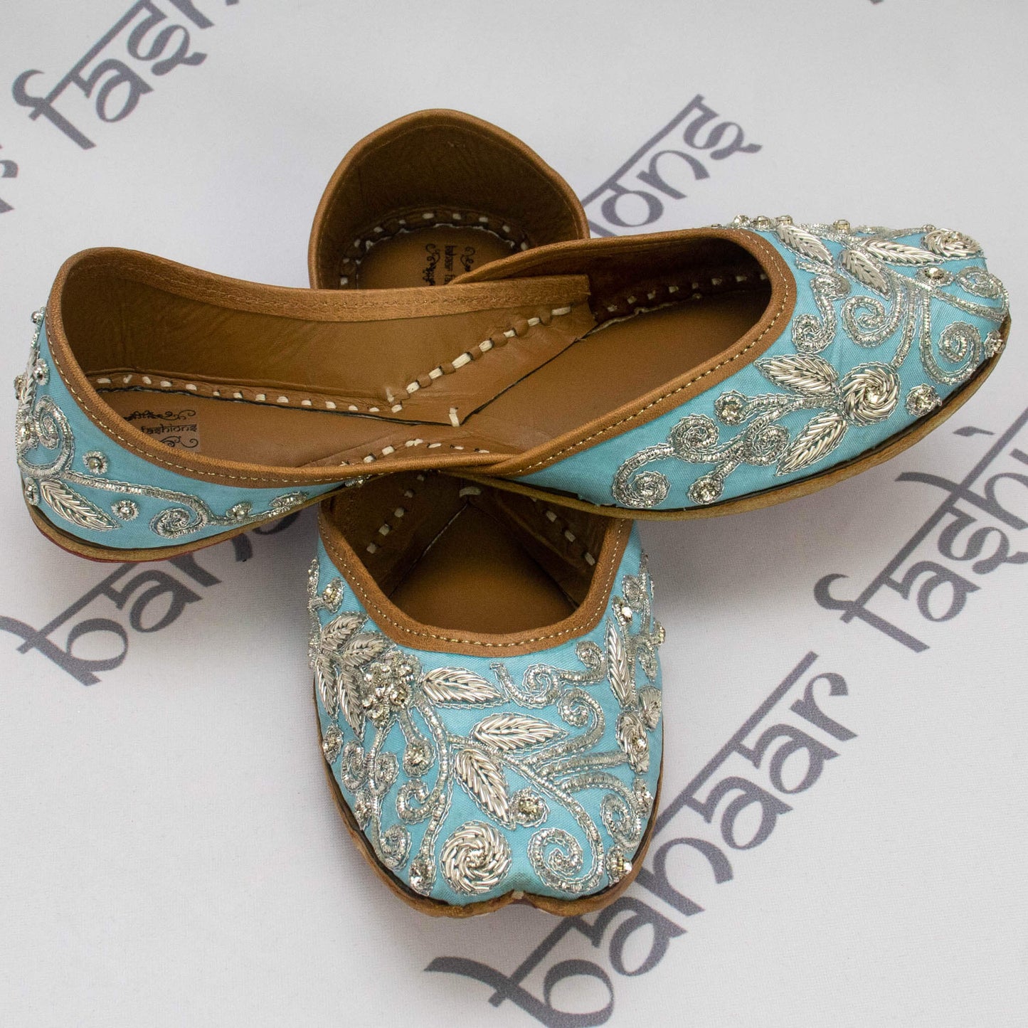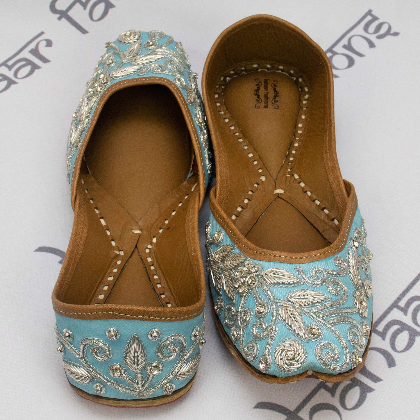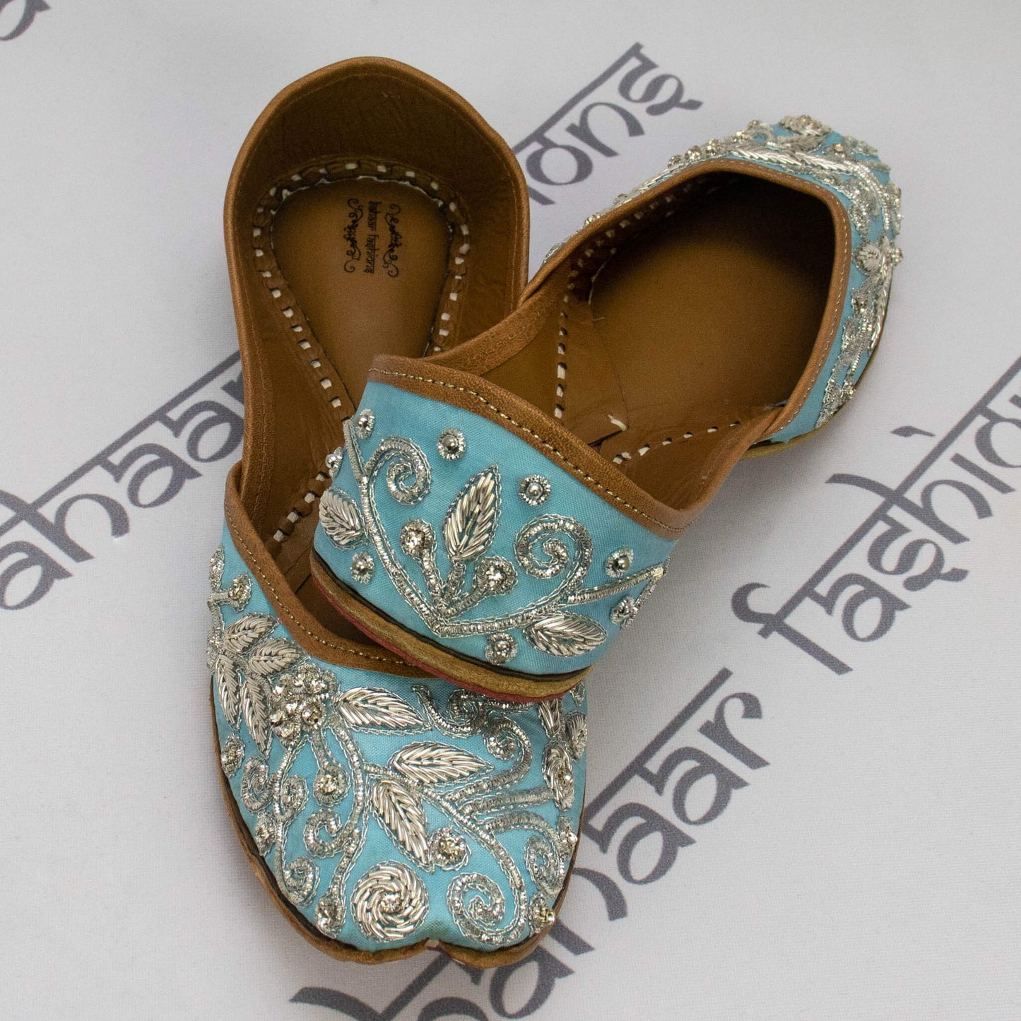 Regular price $15.00Exquisite ice blue punjabi jutti embellished with intricate zardozi embroidery. The interior is made of genuine leather with a double cushion making the jutti very comfortable to wear.