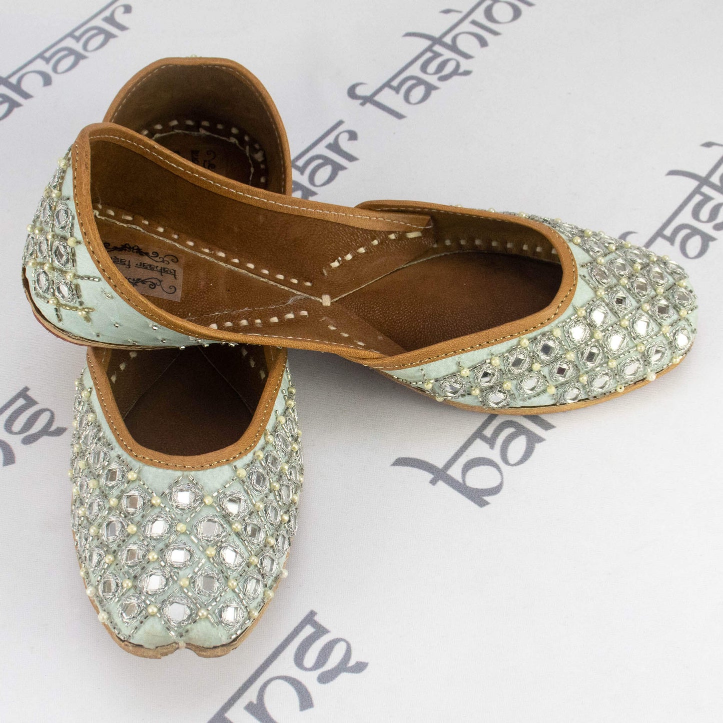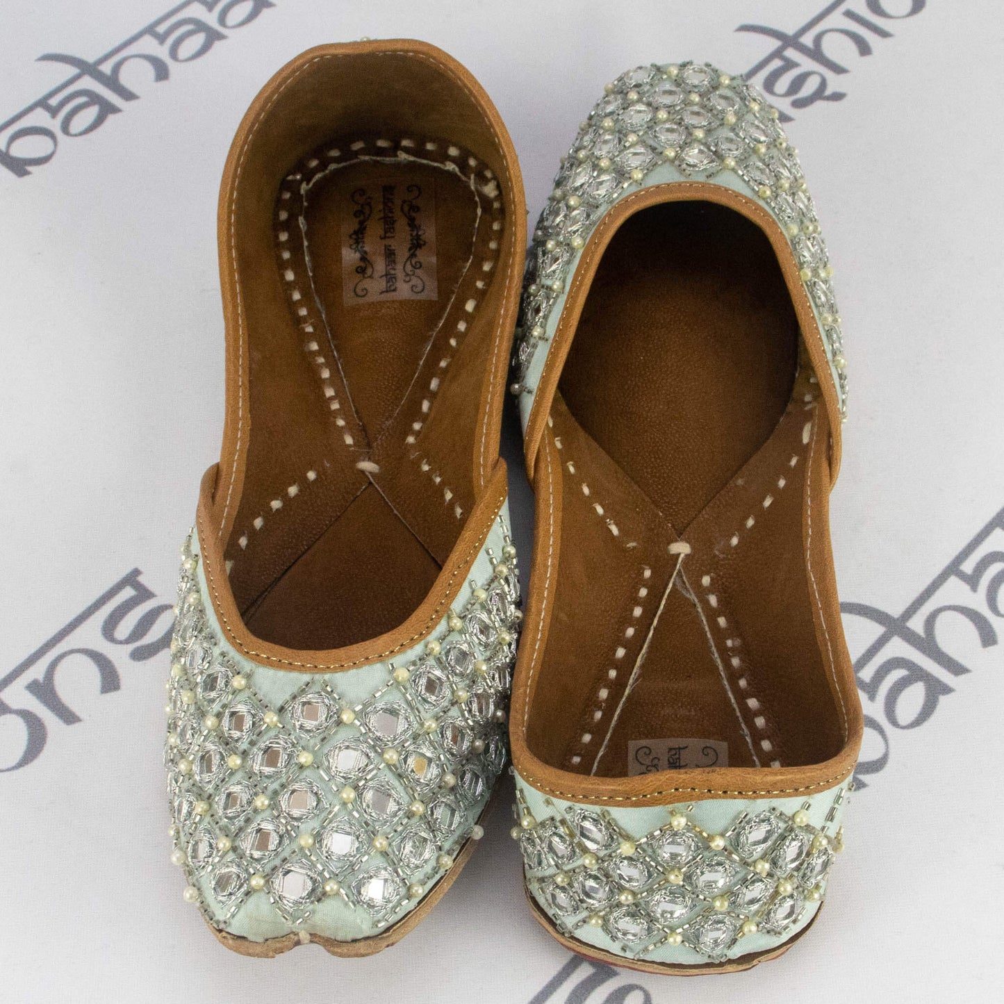 Regular price $11.50Dusty blue punjabi jutti beautifully handcrafted with mirror work and beaded work. The interior is made of genuine leather with double cushioning making the jutti very comfortable to wear.