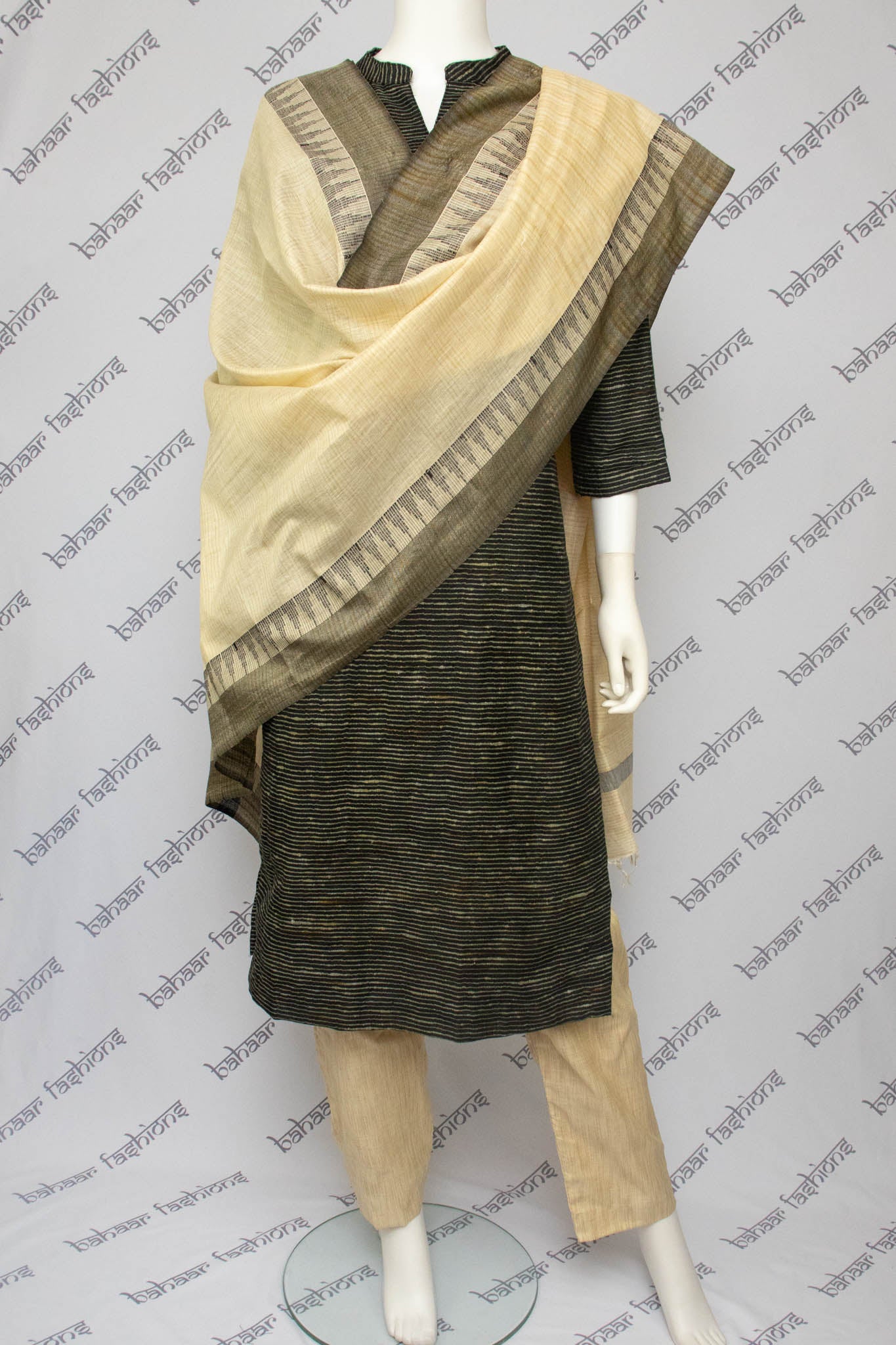 Khadi cotton kameez with dhuppata and trouser pants. Trouser pants with pockets and elastic on the waist. Dhuppata embellished with tassels. Lining inside pants and kameez.