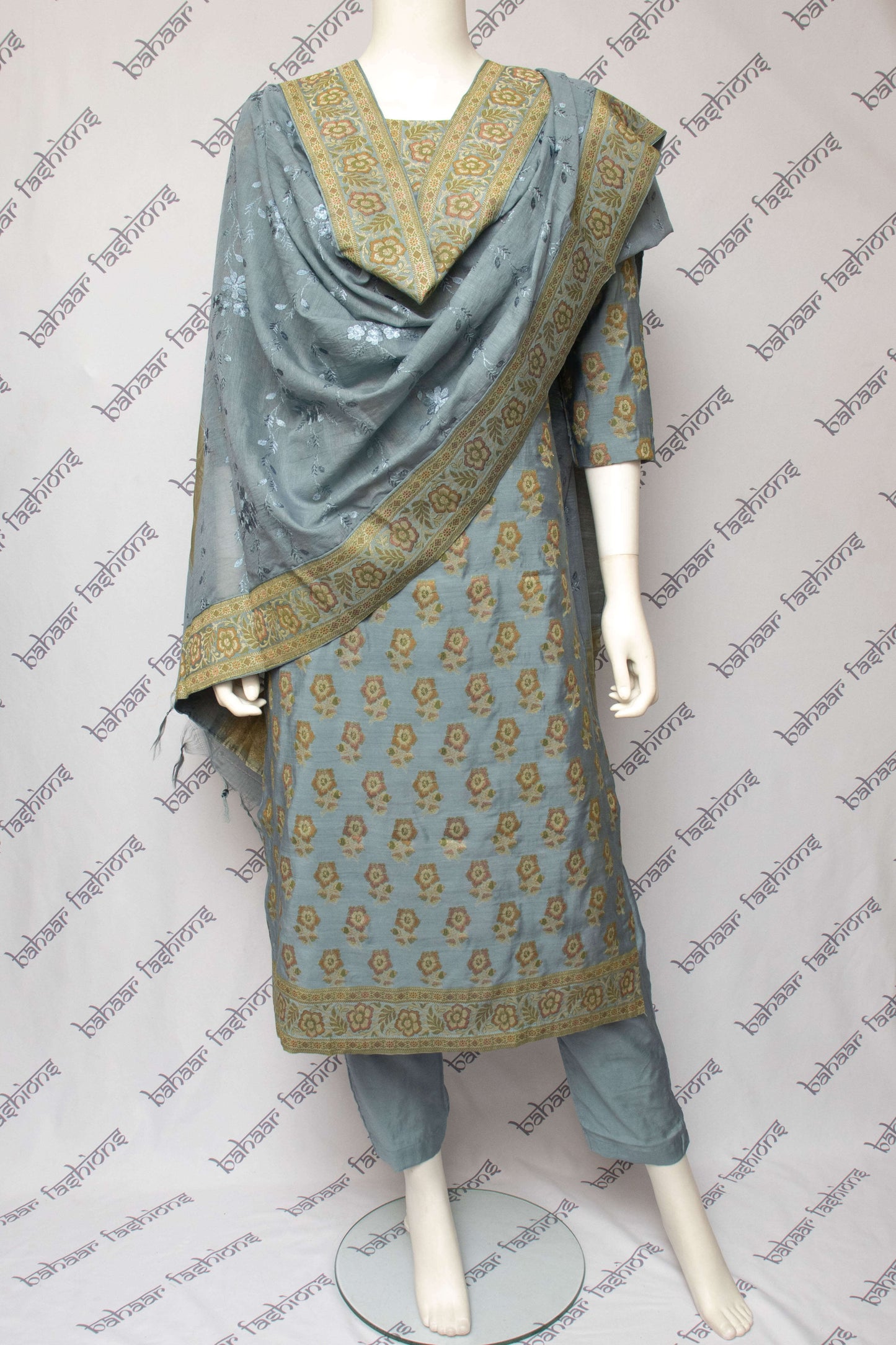 Banarsi soft cotton linen kameez paired with a thread embroidered linen dupatta. There is lining on the kameez only. The cotton silk pants have pockets and elastic at the waist.