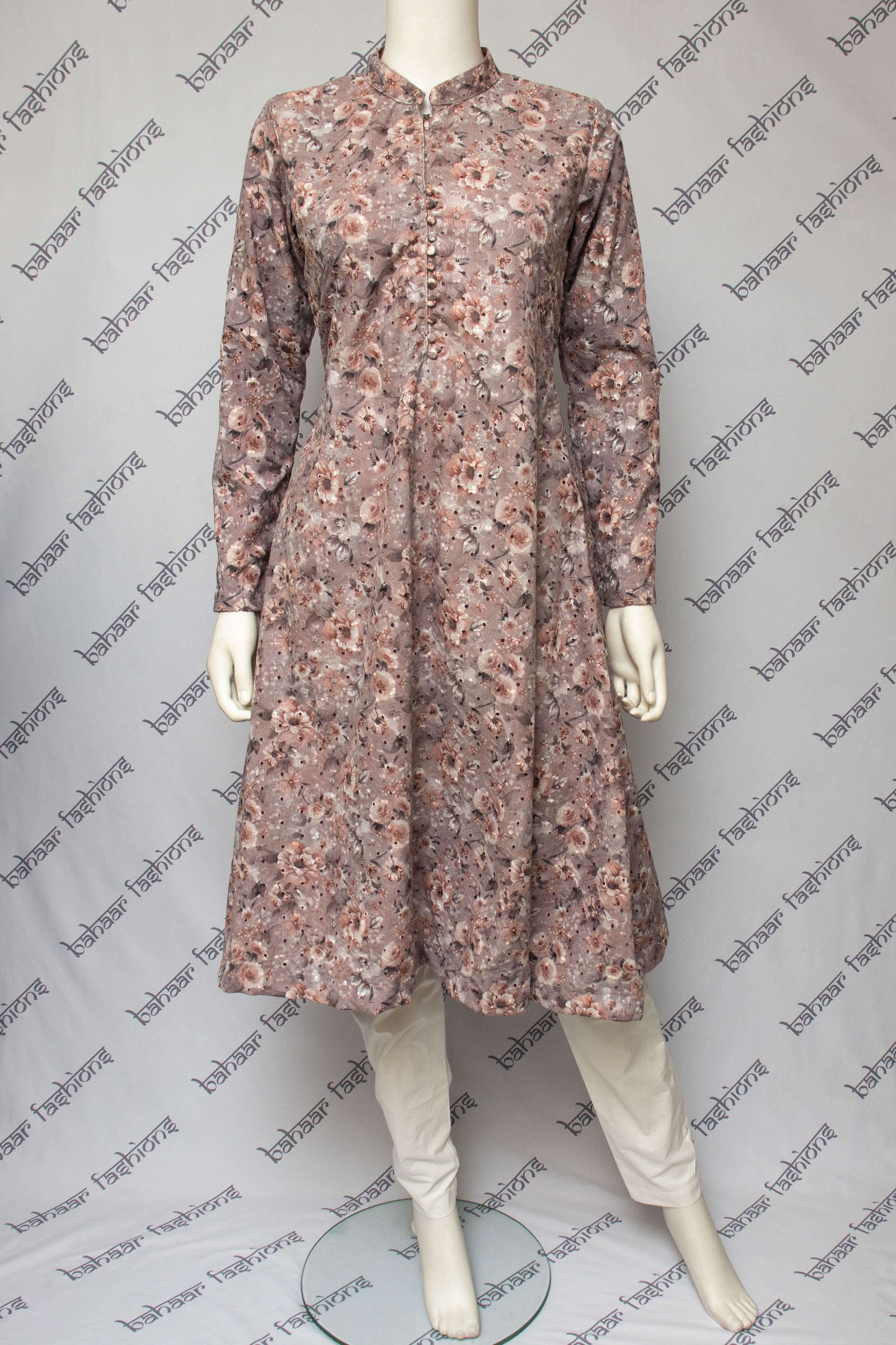 Beautiful floral cotton Hakoba fabric suit. A-line kameez paired with pants and a chiffon tie-dye dupatta with white thread lace. The white cotton pants have pockets and elastic at the waist.