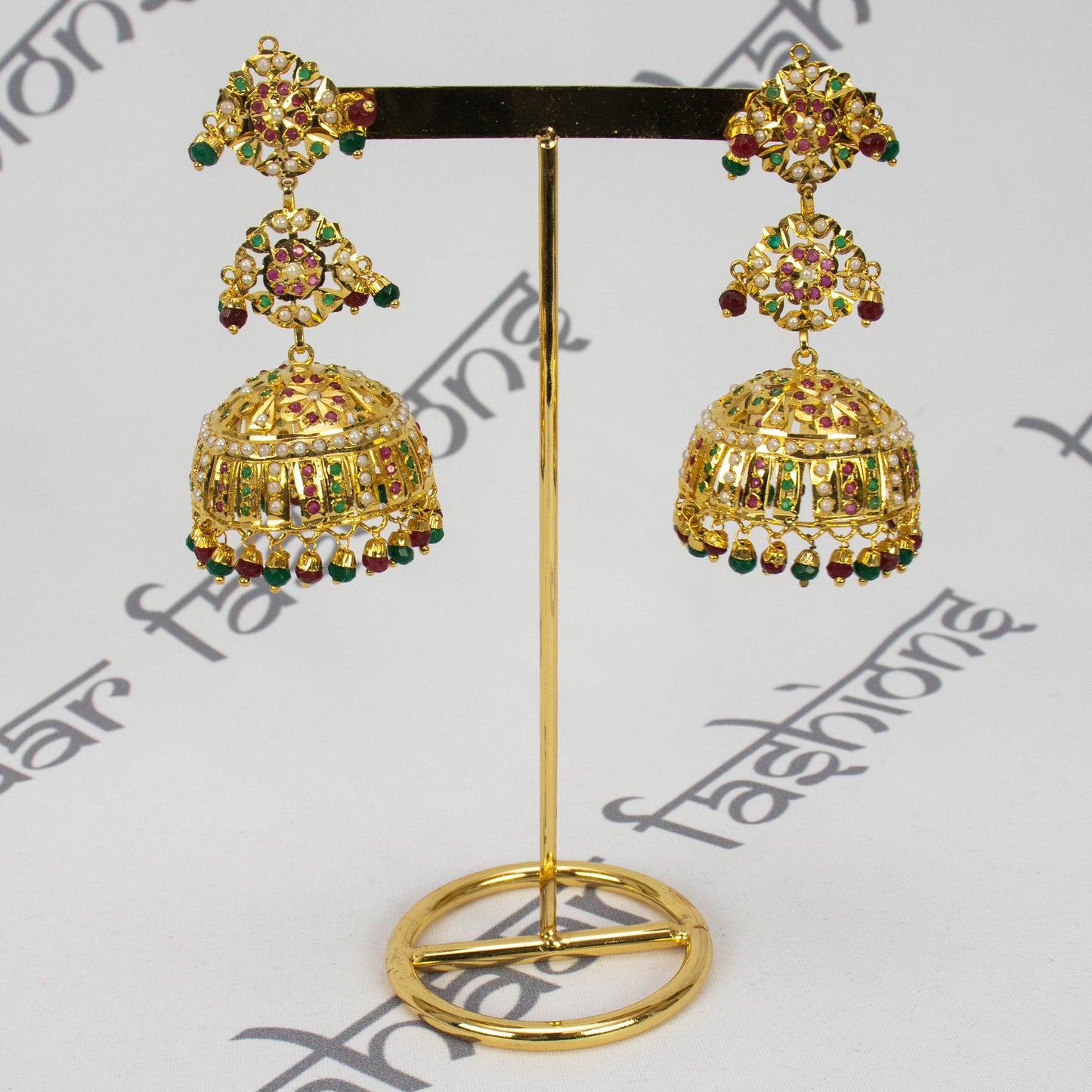 Regular price $36.00Stunning jadau large jhumki earrings with tikka. Very elegant tikka set embellished with green and red rhinestones and white pearl beads. This tikka set is polished with 1 gram of gold.
