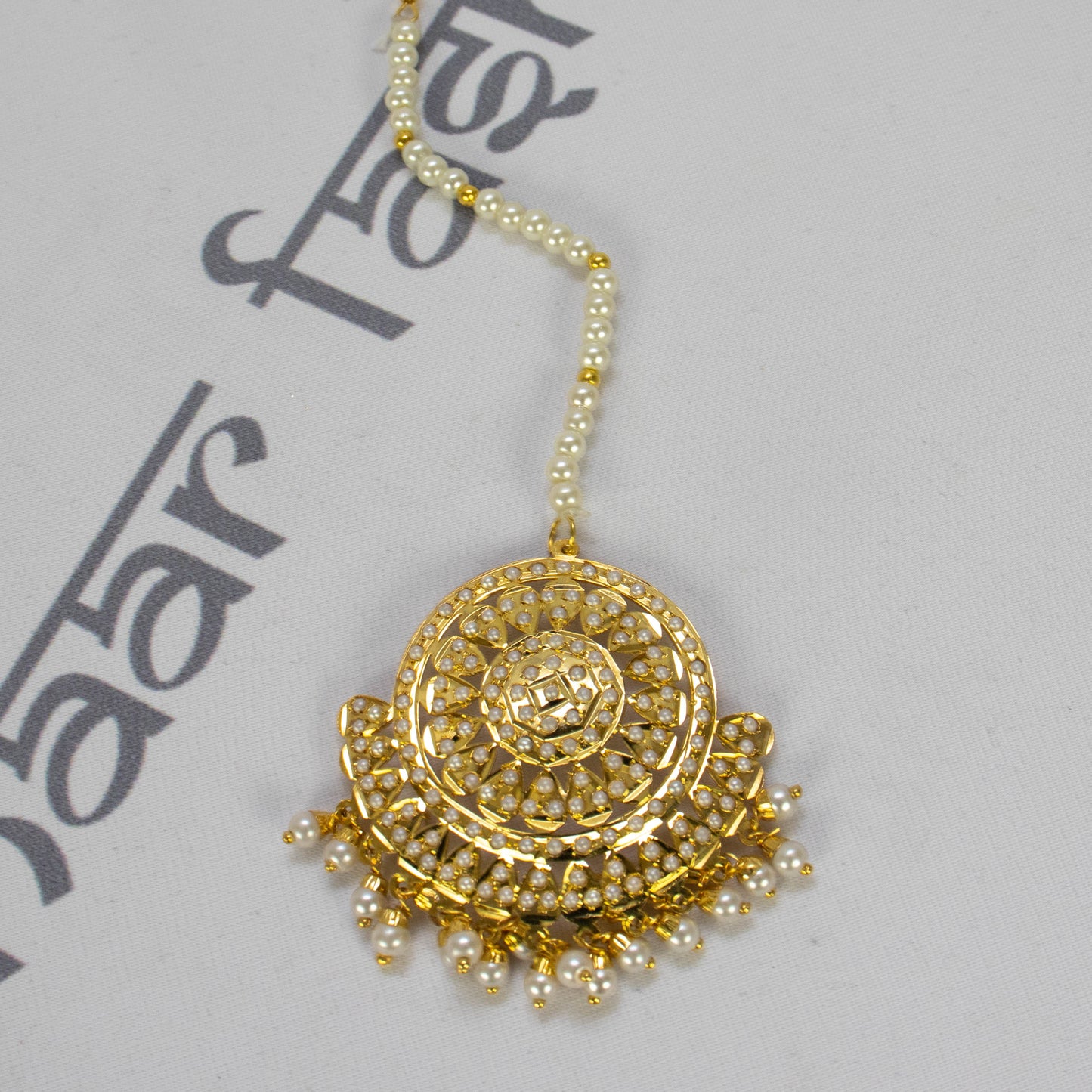 Regular price $36.00Stunning jadau large jhumki earrings with tikka. Very elegant tikka set embellished with white pearls and polished with 1 gram of gold.