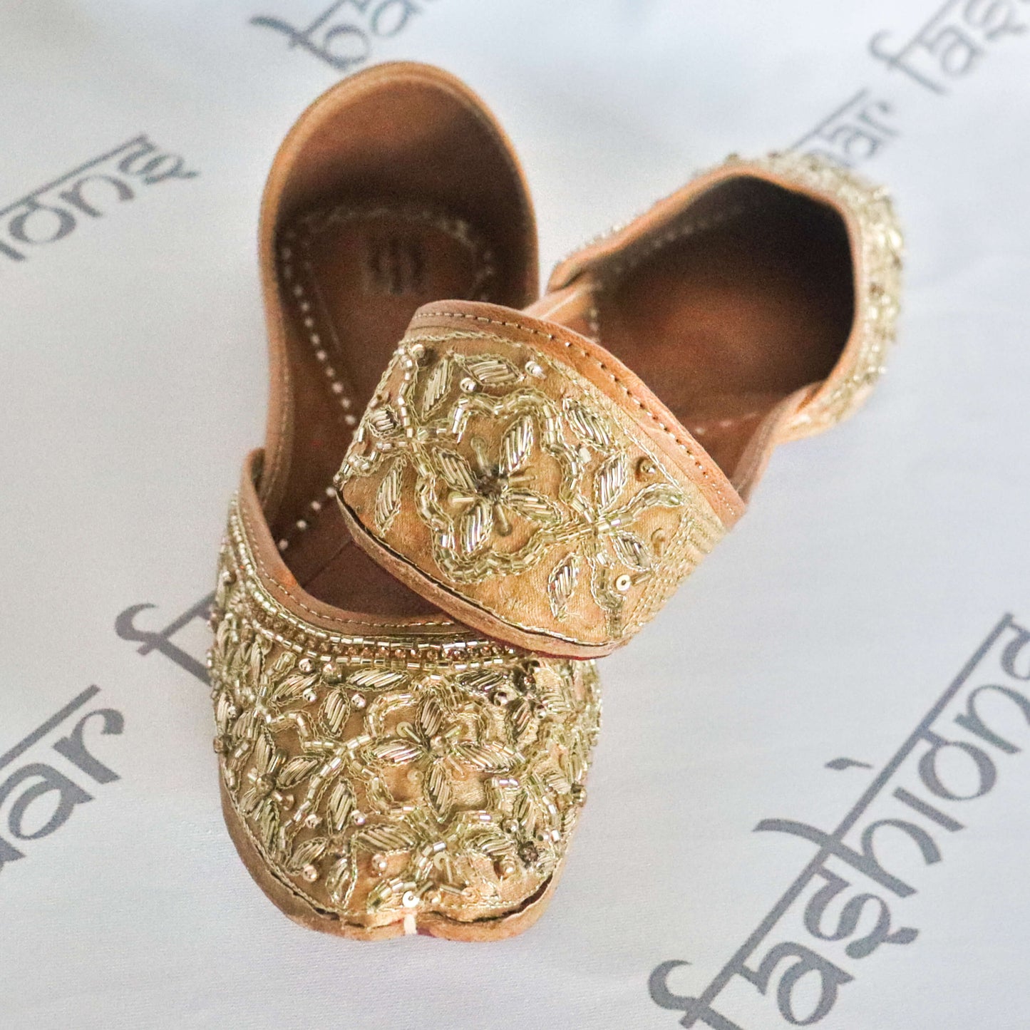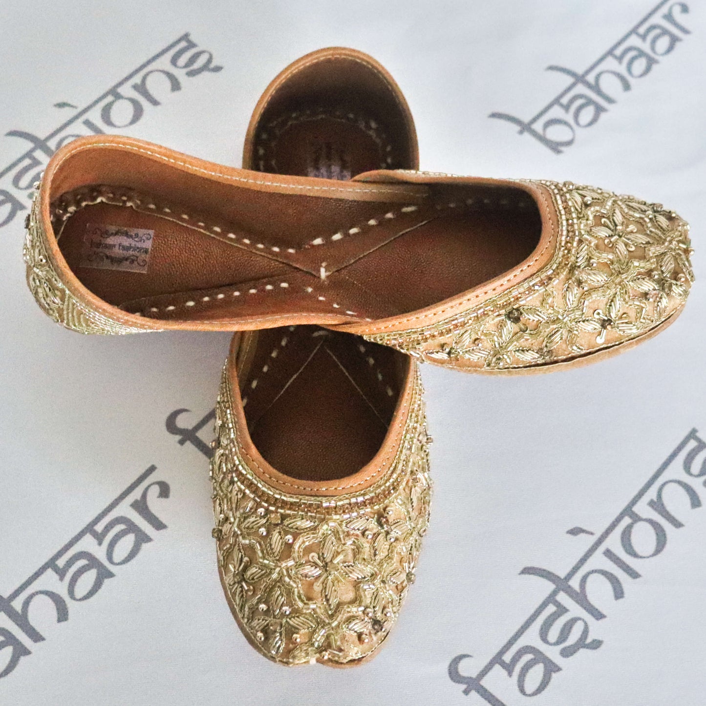Beautifully handcrafted golden jutti with intricate sequins and zardozi work. The interior is made of genuine leather with a double cushion, making the jutti very comfortable to wear.