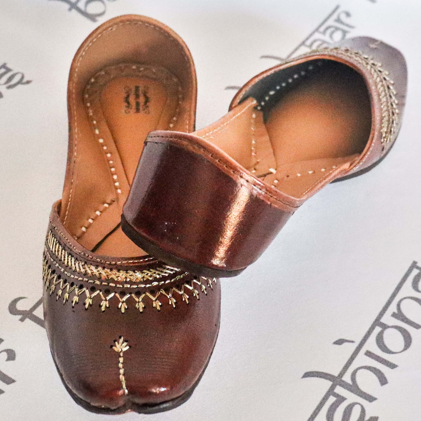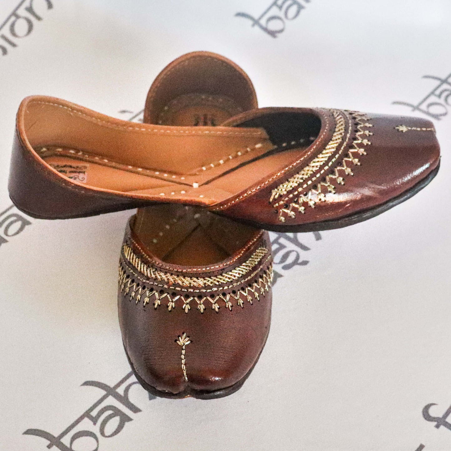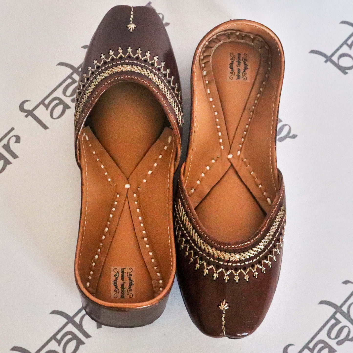 Stunning dark brown jutti embellished with intricate thread embroidery. The interior is made of genuine leather with a double cushion, making the jutti very comfortable to wear.