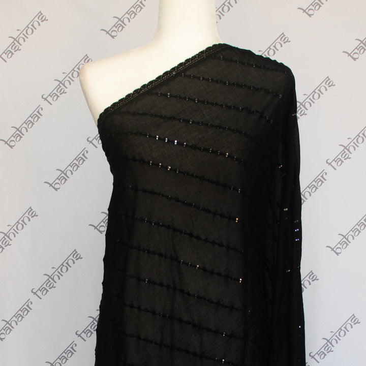 Elegant black cotton dupatta with intricate thread and sequin work, and finished with a beautiful lace. A must-have piece to pair with both traditional and contemporary outfits.