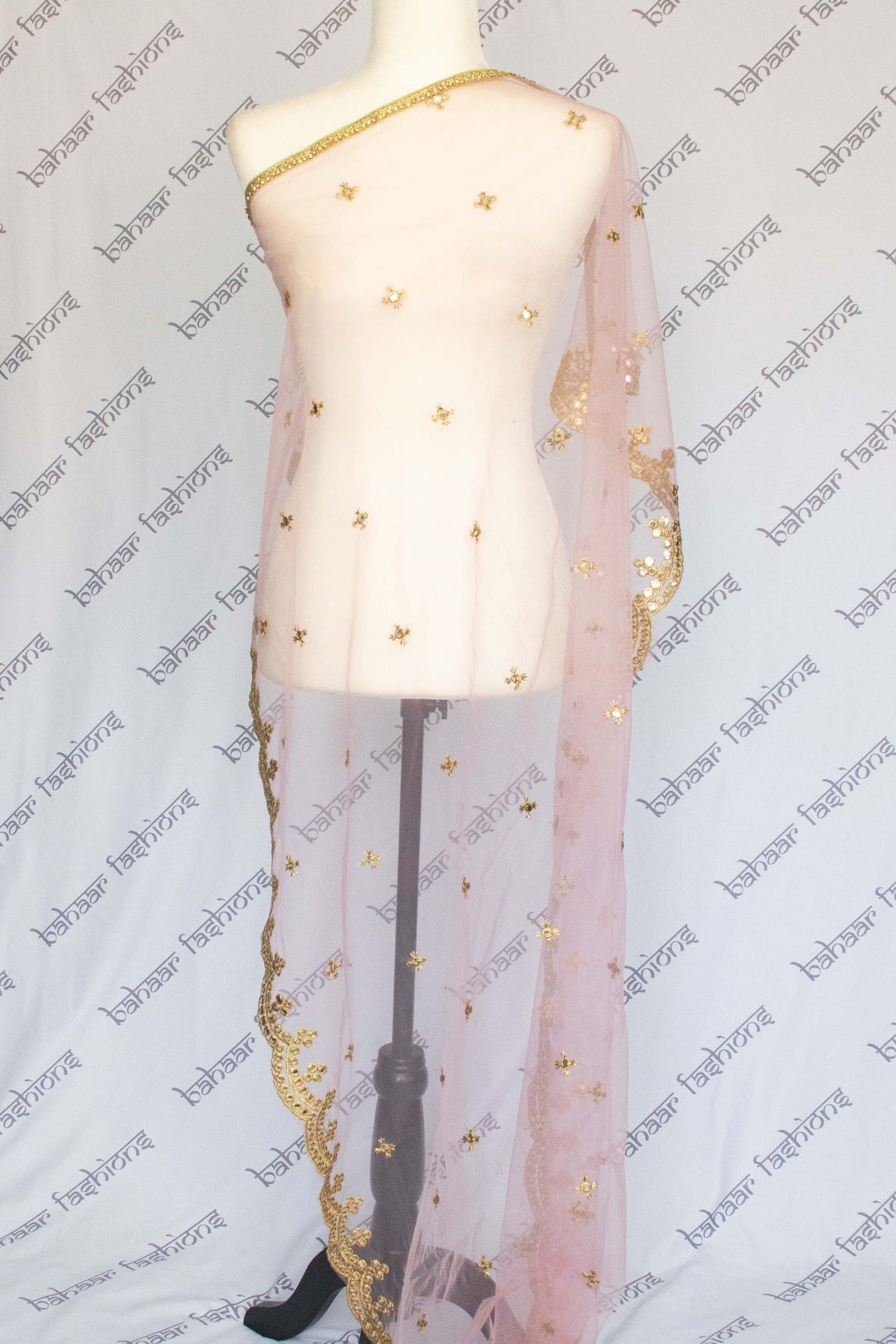 Scalloped dusty rose net dupatta with golden foil and golden thread work.