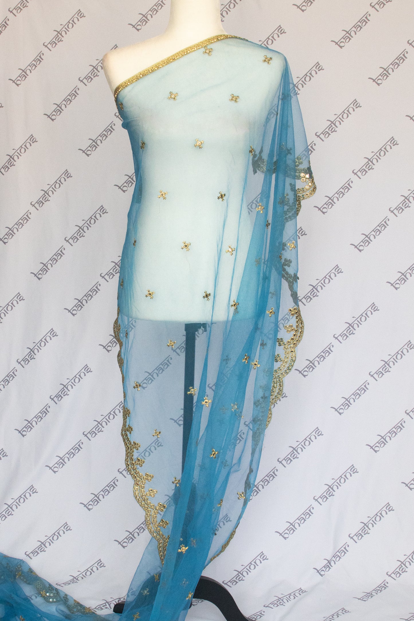 Scalloped peacock blue net dupatta with golden foil and golden thread work.