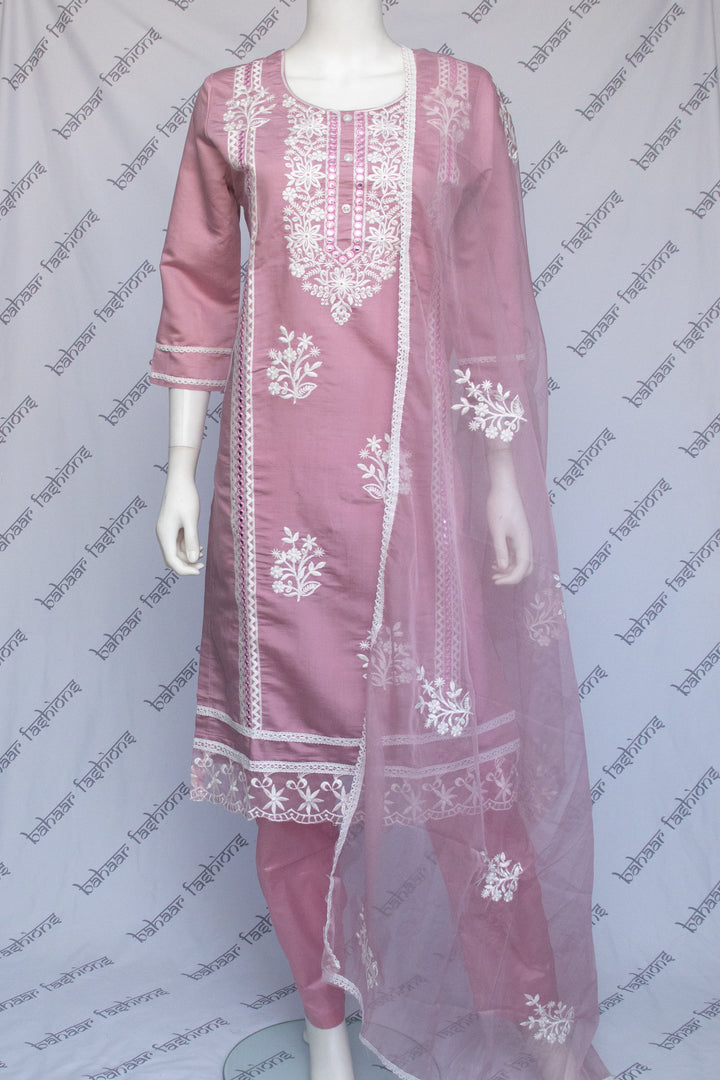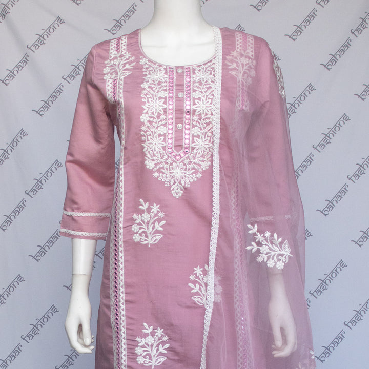 Elegant cotton suit embellished with delicate floral thread embroidery and subtle foil work. A perfect blend of simplicity and charm, ideal for graceful everyday wear and occasional wear. This three-piece set...