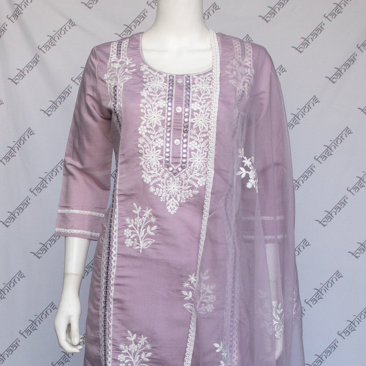 Elegant cotton suit embellished with delicate floral thread embroidery and subtle foil work. A perfect blend of simplicity and charm, ideal for graceful everyday wear and occasional wear. This three-piece set...