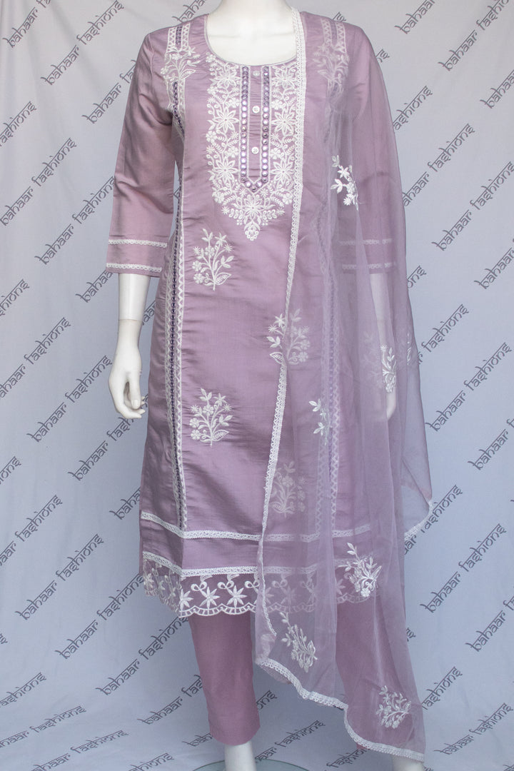 This three-piece set includes a cotton kameez, a santoon pants, and an organza dupatta.