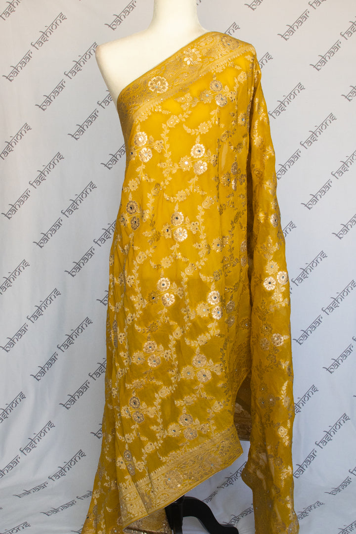 Elevate your look with this beautiful yellow Banarsi dupatta, delicately embellished with sparkling rhinestones. Its rich weave and subtle shimmer make it the perfect statement piece to pair with your favorite outfit — whether for festive occasions, weddings, or elegant evenings.