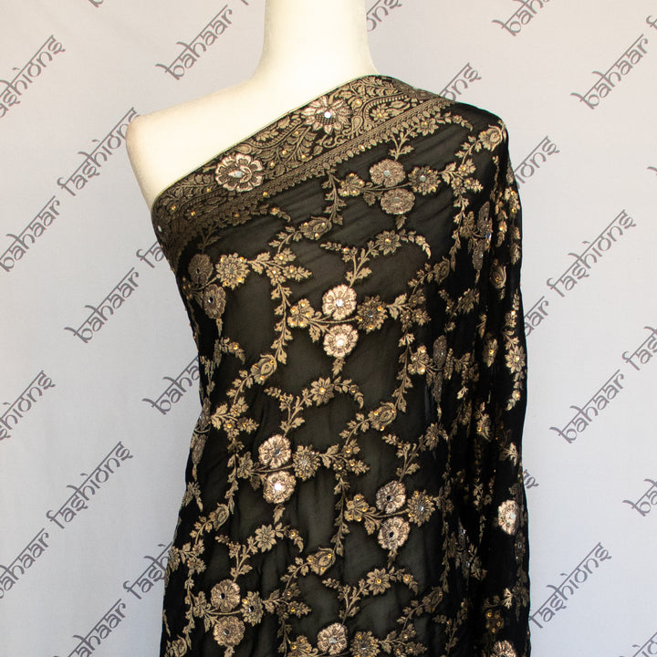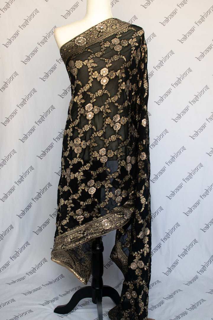 Elevate your look with this beautiful black Banarsi dupatta, delicately embellished with sparkling rhinestones. Its rich weave and subtle shimmer make it the perfect statement piece to pair with your favorite outfit — whether for festive occasions, weddings, or elegant evenings.