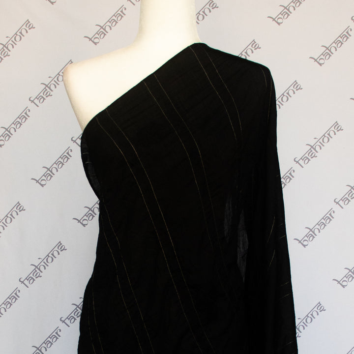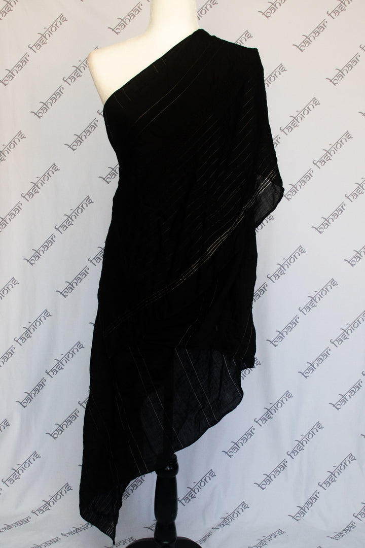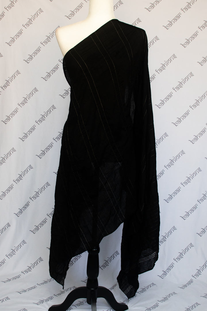 Black cotton dupatta with intricate thread work, highlighted with delicate golden wire detailing. A timeless piece that adds elegance to any outfit.